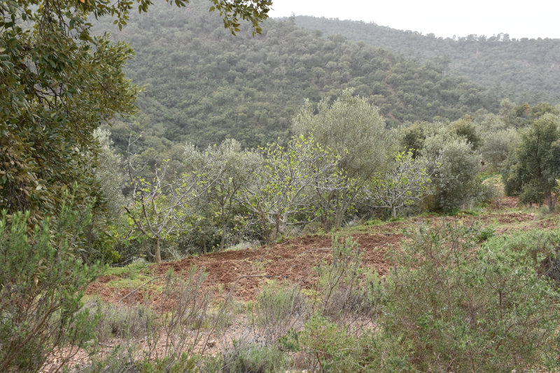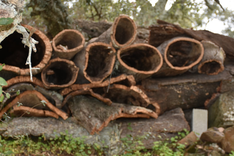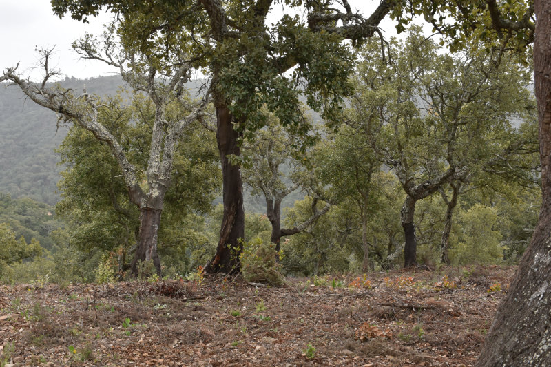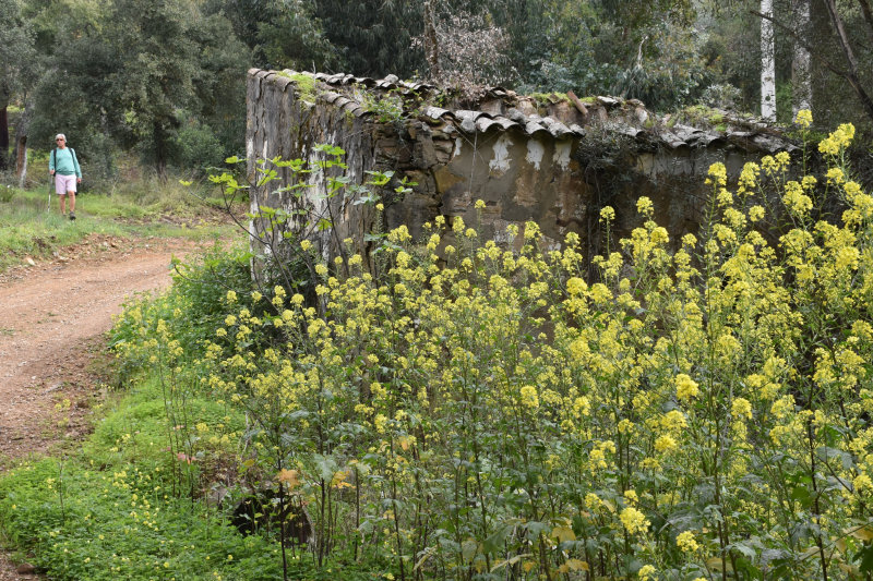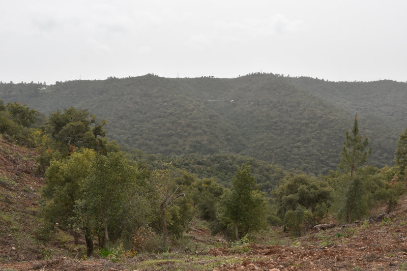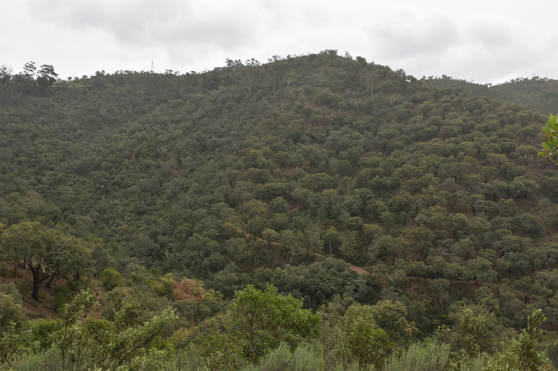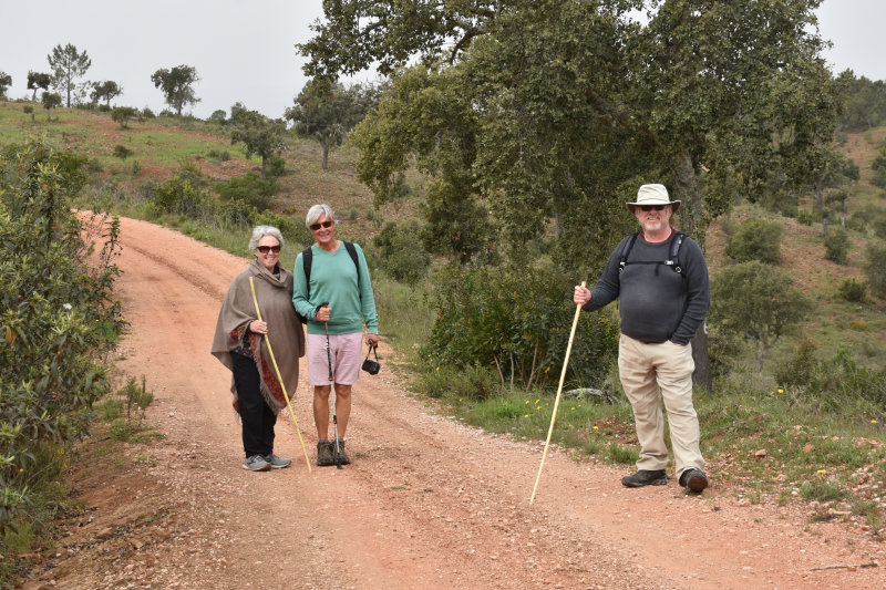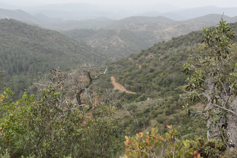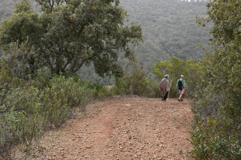 The trail is a loop of 3 or 4 kms beginning and ending where we parked the car. It descends into the river valley and leads back out again. It’s a relatively well groomed path that wanders through groves of cork trees and offers some wonderful views of the valley and hillsides. Today, however, the view was somewhat obscured by the fog/mist that has covered the entire area for several days. It arrived from the Sahara laden with tiny particles of sand that cover and filter into everything and becomes an annoying slurry of mud when mixed with rain. I will post some images from Wednesday afternoon when the sky became an orange/pinkish/brown colour. The photos look like sepia images.