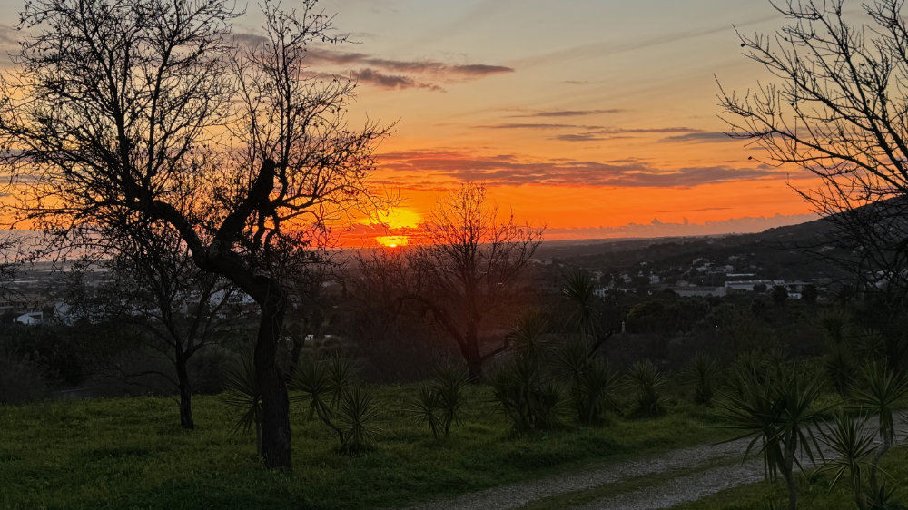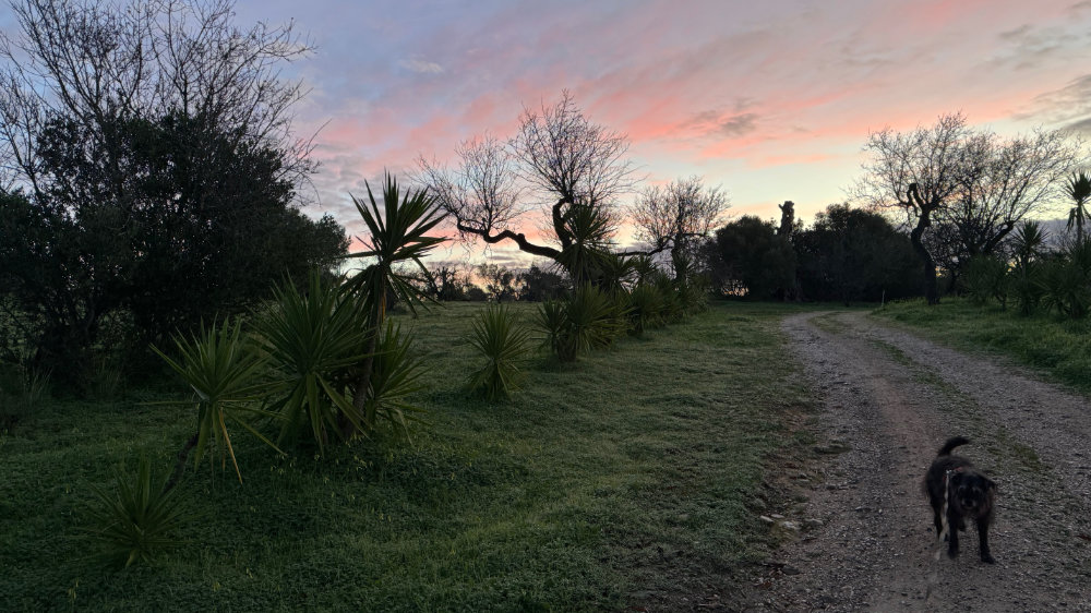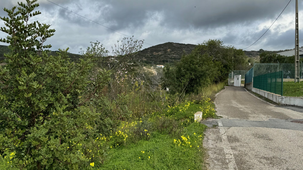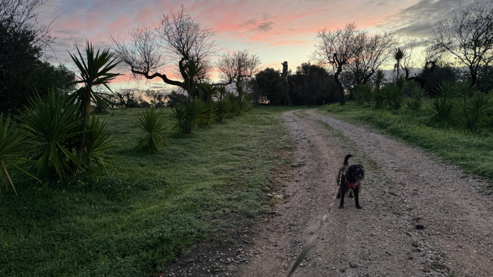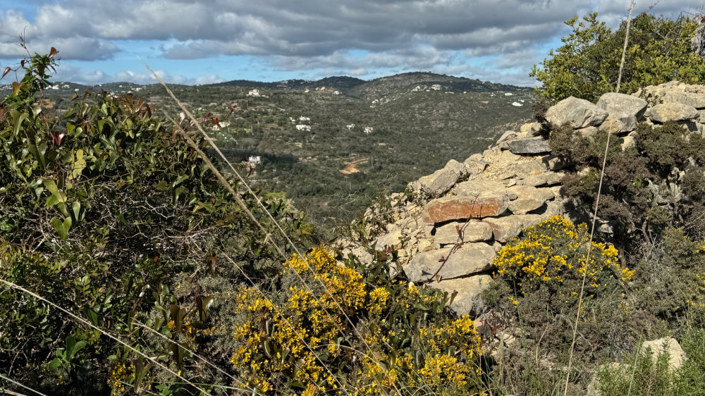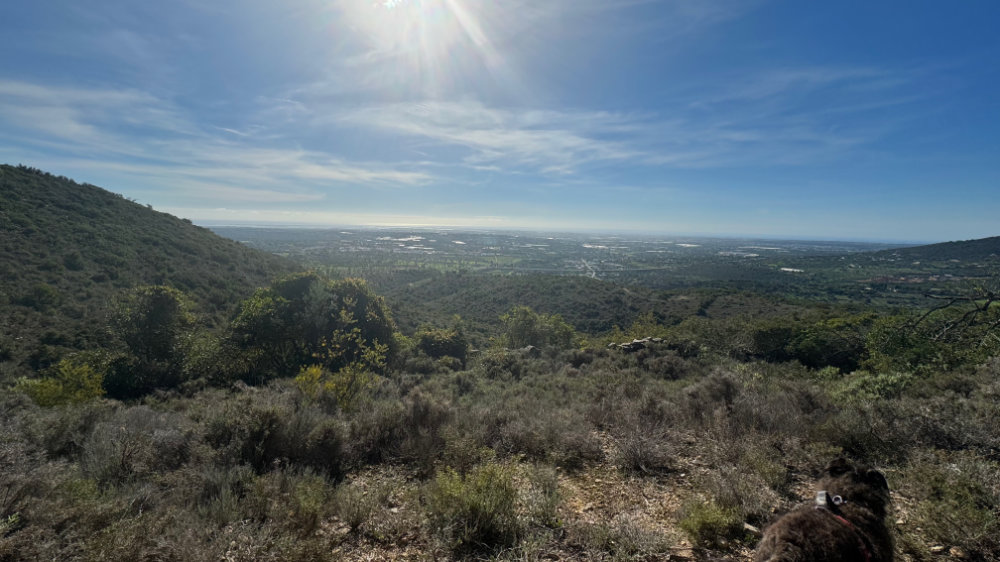 It was a bright sunny day with a lovely breeze. Just right for a hike up the “back” of the hill we toured yesterday. However, our favourite access point has now been blocked by fencing. So, we continued further along the paved road to another track we had never climbed. It was an amazing climb and the views were spectacular and it connects to the trail I had originally intended to climb. Jackson actually found the link: a narrow overgrown path totally sheltered from above. There was a medronho tree near the end covered in last years’ fruit.