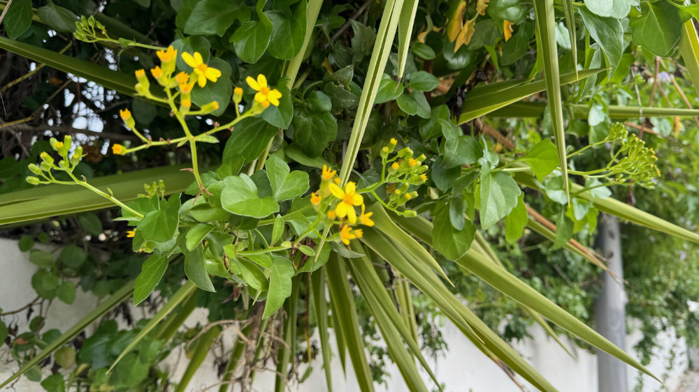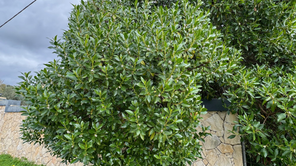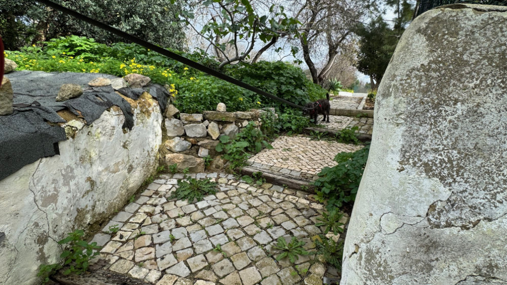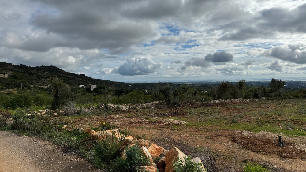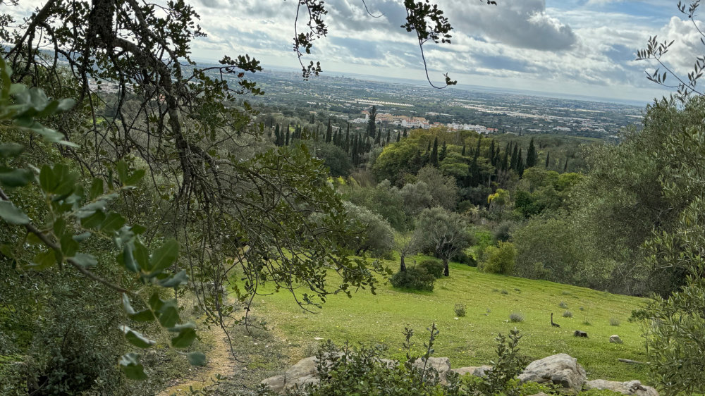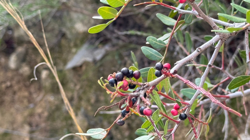 It was a bright sunny day with a lovely breeze. Just right for a hike up the “back” of the hill we toured yesterday. However, our favourite access point has now been blocked by fencing. So, we continued further along the paved road to another track we had never climbed. It was an amazing climb and the views were spectacular and it connects to the trail I had originally intended to climb. Jackson actually found the link: a narrow overgrown path totally sheltered from above. There was a medronho tree near the end covered in last years’ fruit.
