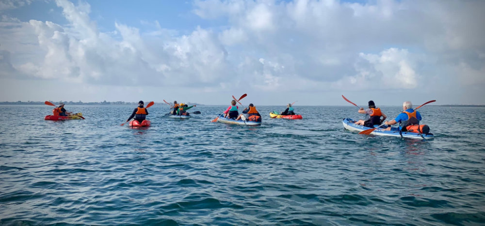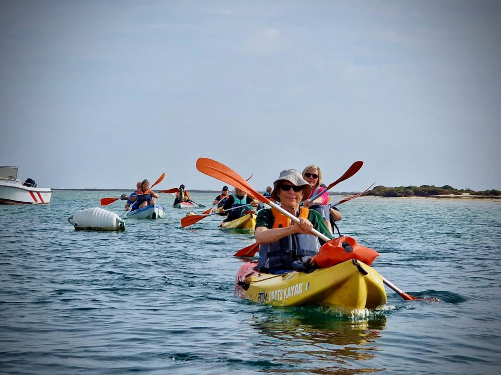 After a leisurely lunch and many games of toss the sea shell for Spike the dog, we waded across the shallow river of salt water back to our kayaks.