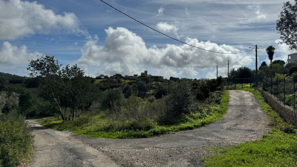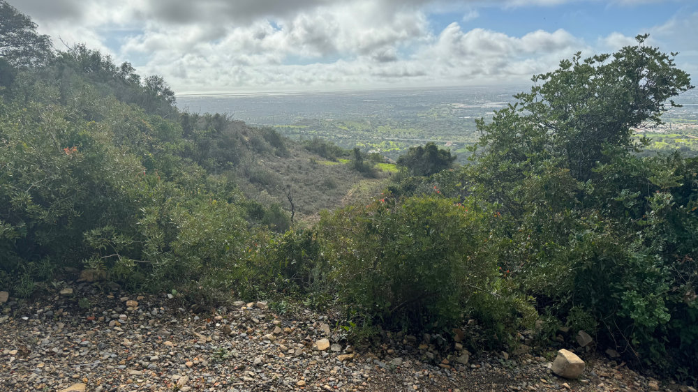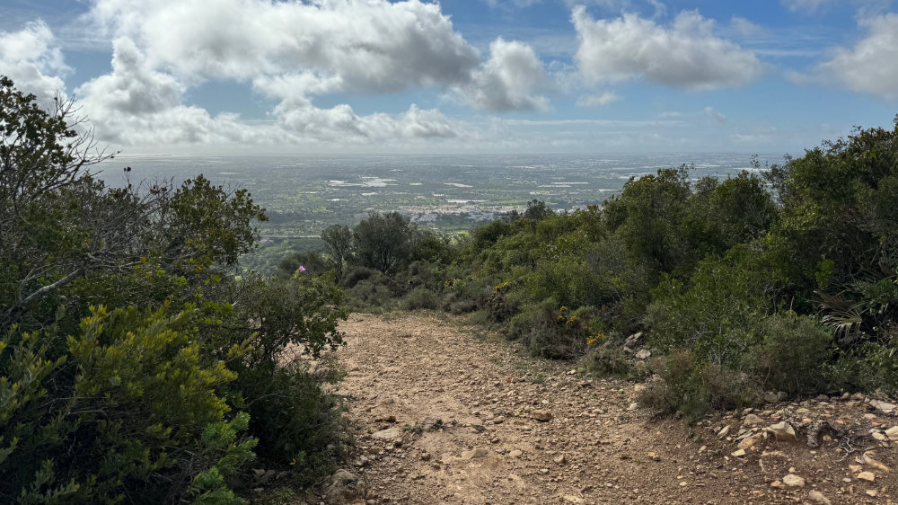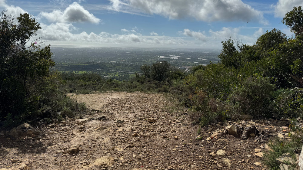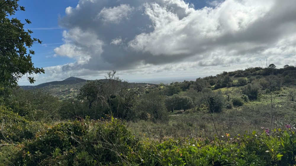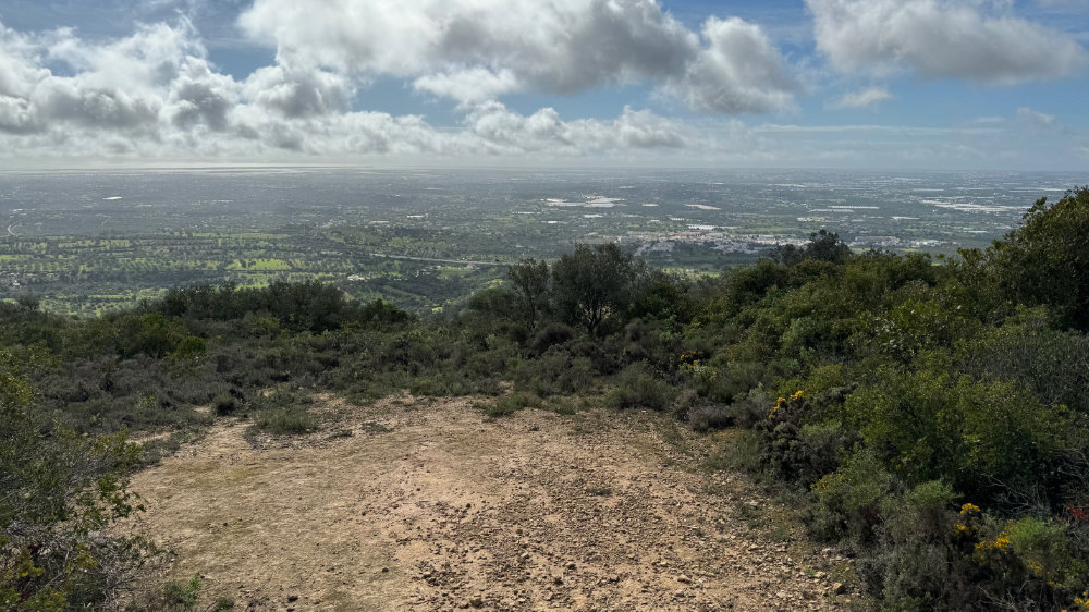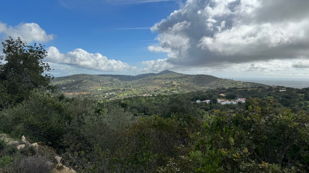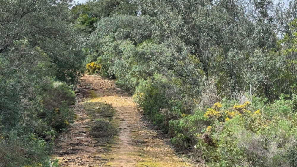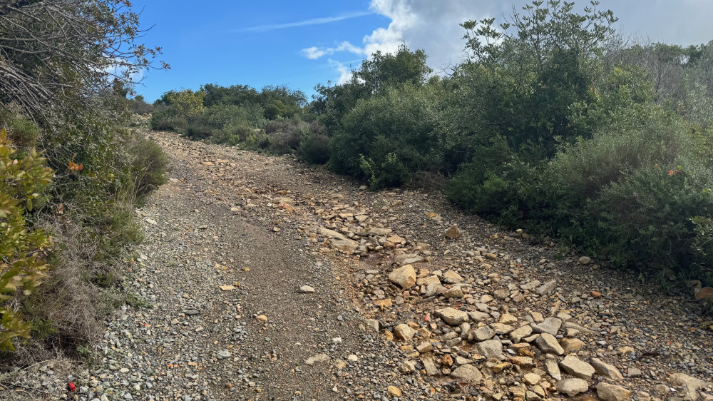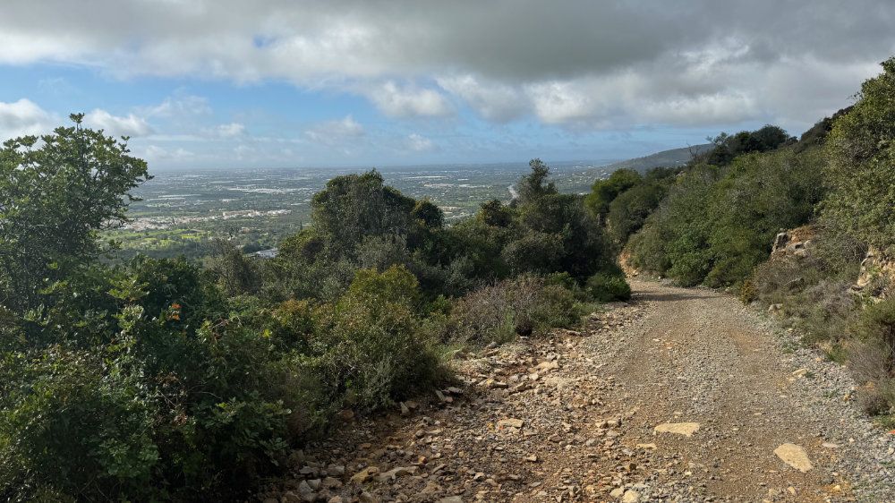 Sunday was a literal washout with the rain but Monday Feb 12 was sunny with the mercury hitting 20 degrees Celsius by early afternoon. it was high time for a decent hike, so Jackson and I set off up the hill behind the quinta toward the shrine. Three quarters of the way up, there is a gravel track that runs laterally across the south side of the hill and connects with a tiny paved road just east of the summit. I thought it time to revisit this route.