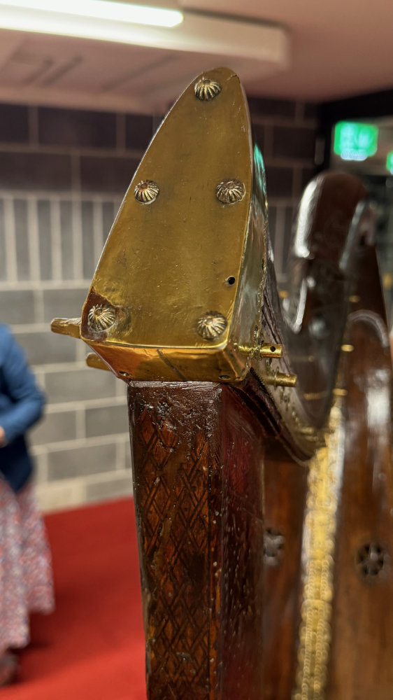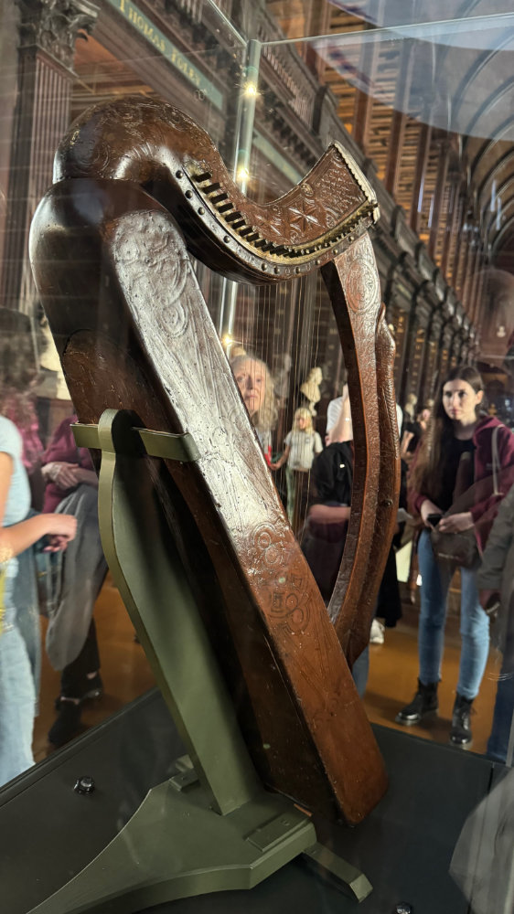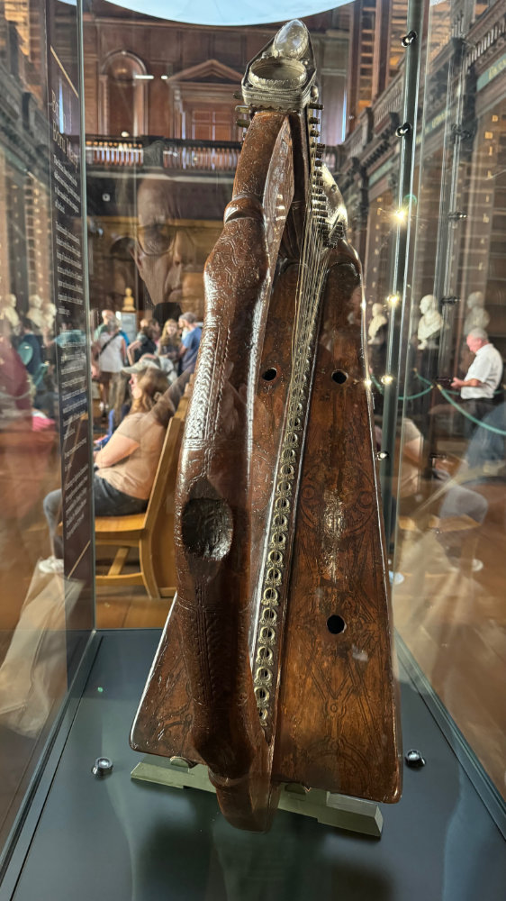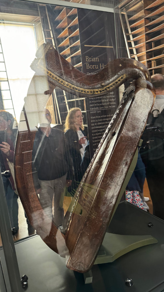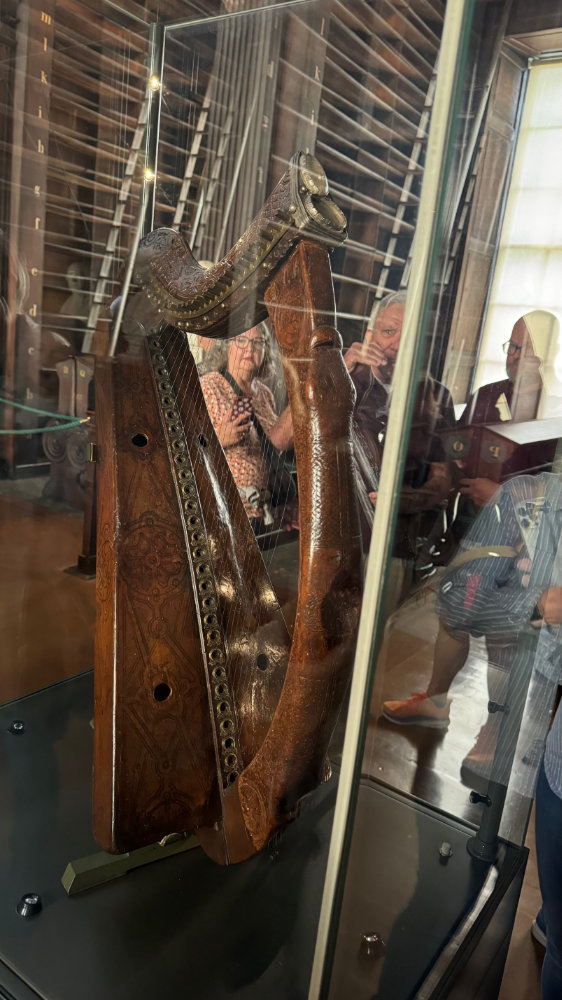 The early Irish wire strung harp precedes the modern day pedal harp or orchestral harp by approximately 400 years. It has a clear bell like sound when properly played with the fingernails rather than the pads of the tips of the fingers. It was a strong Irish tradition that existed for several centuries and was an essential part of the social fabric particularly for the wealthy. They were the ones that could afford to support a harper and have harps made. The tradition began to disappear in the mid-eighteenth century and there is evidence being unearthed by Simon Chadwick that individual harpers in the tradition were alive and playing in the nineteenth century. The instruments and fragments of harps we were visiting are of the earlier variety especially the two in Trinity College: the Castle Otway and Brian Boru harps. The former is not on public display and the latter is in the College Library long room that is currently empty of books. We had the privilege of up close and personal but no touching view of the instruments.