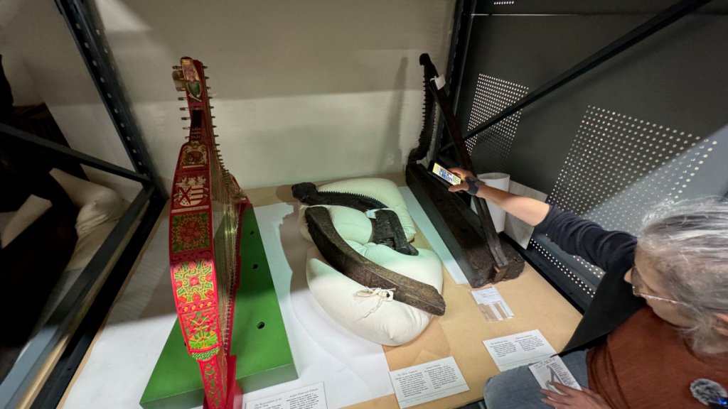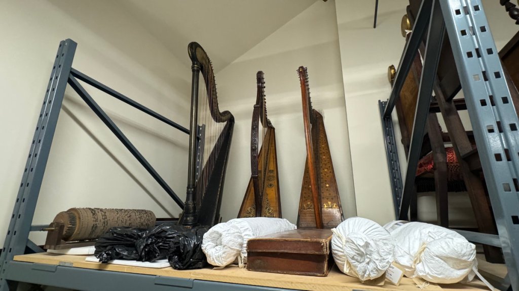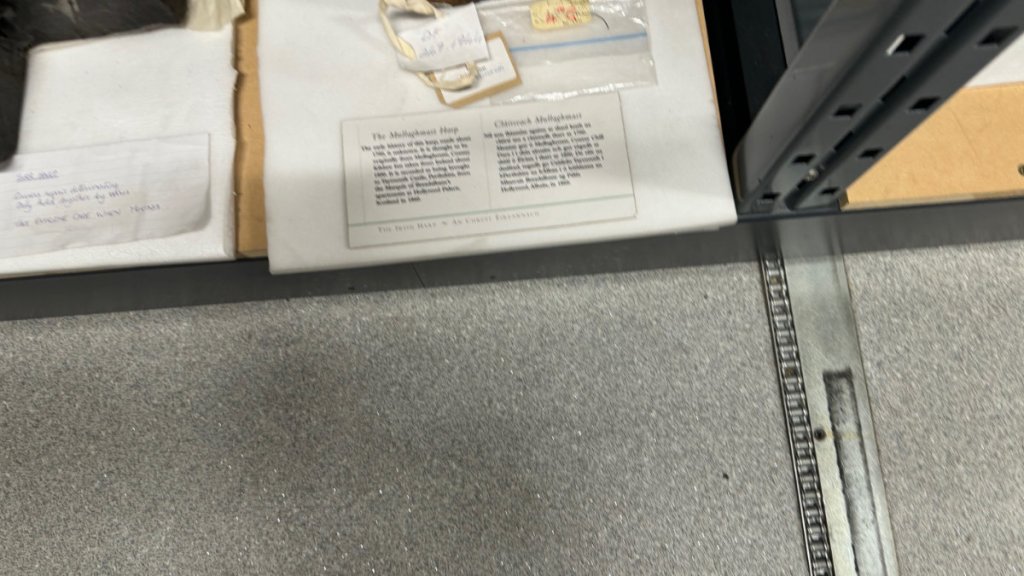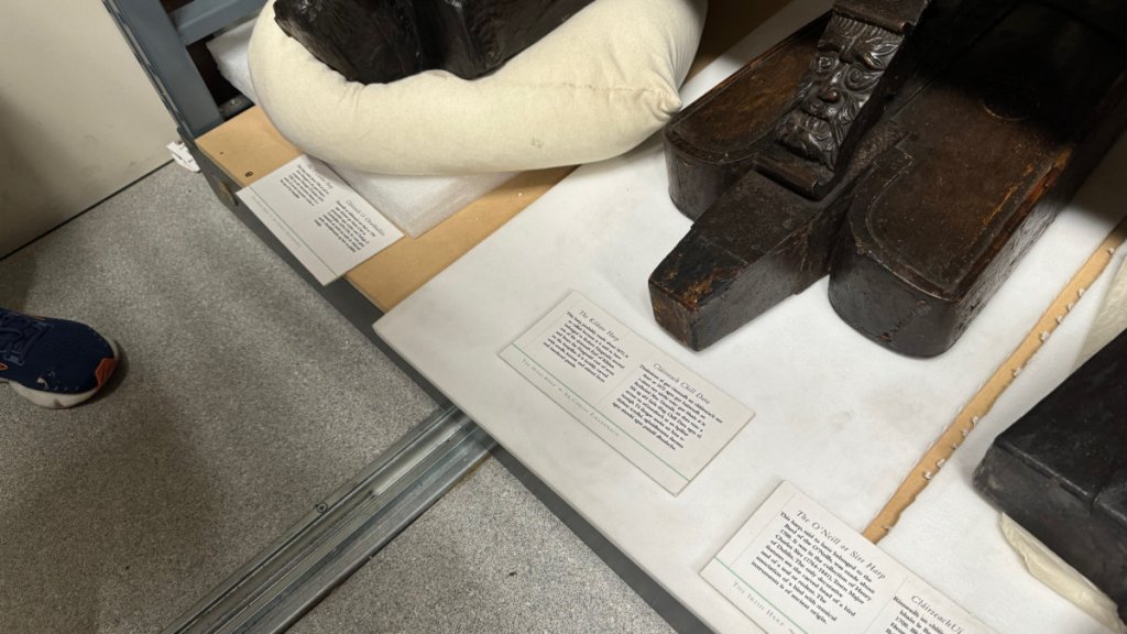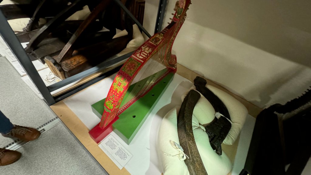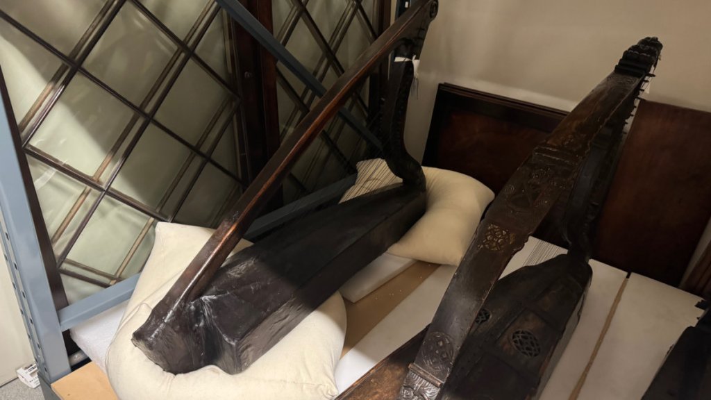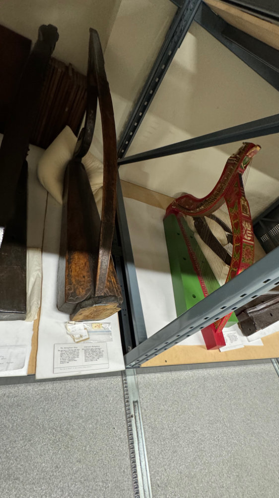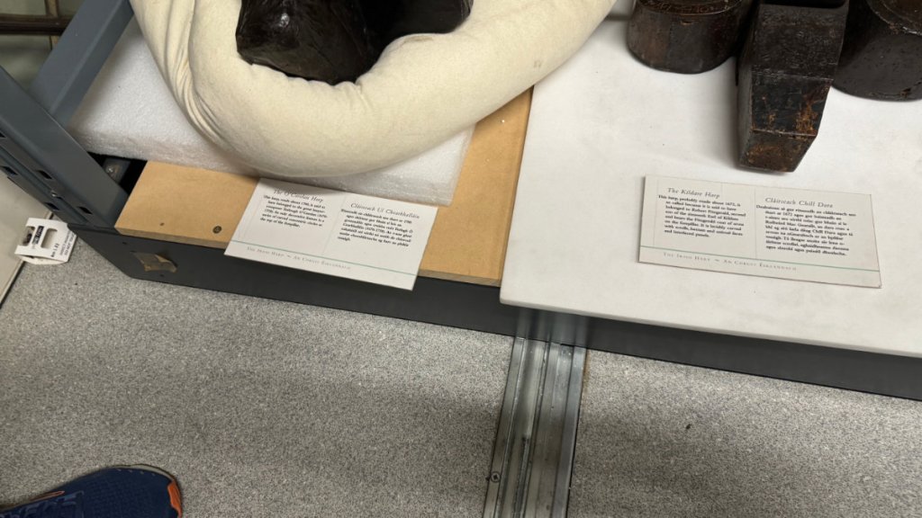 The harps at the National Museum are in climate controlled storage. They are all in fragile condition with the exception of the reproduction of one of them: the Cloyne harp.