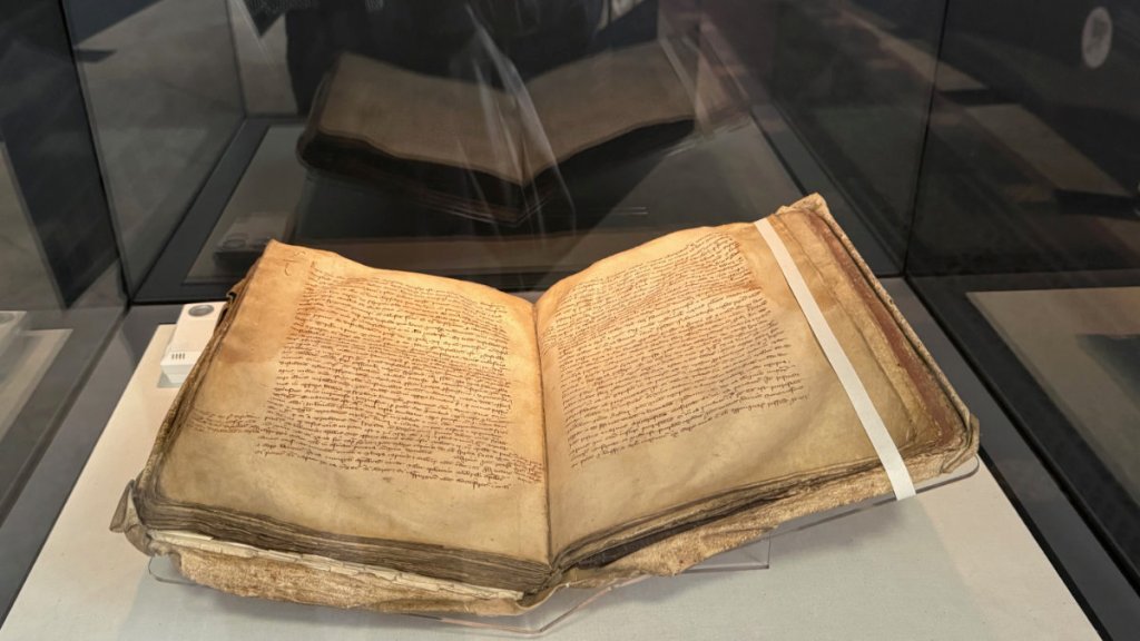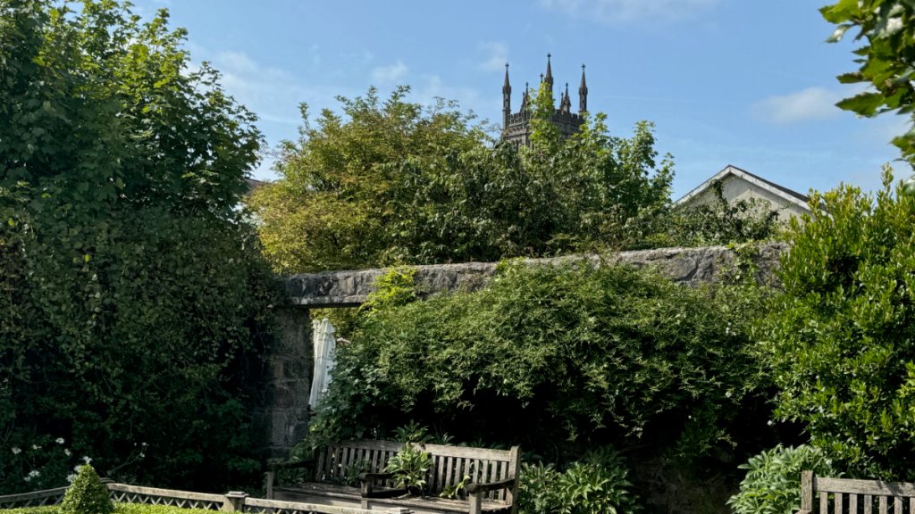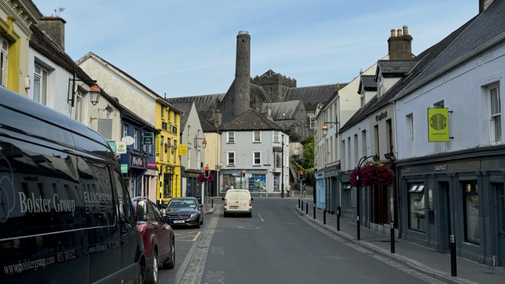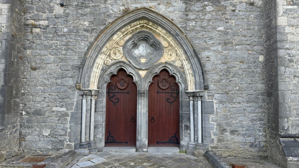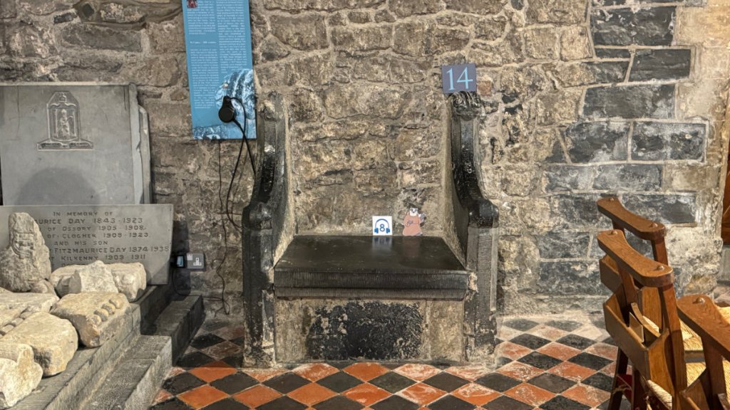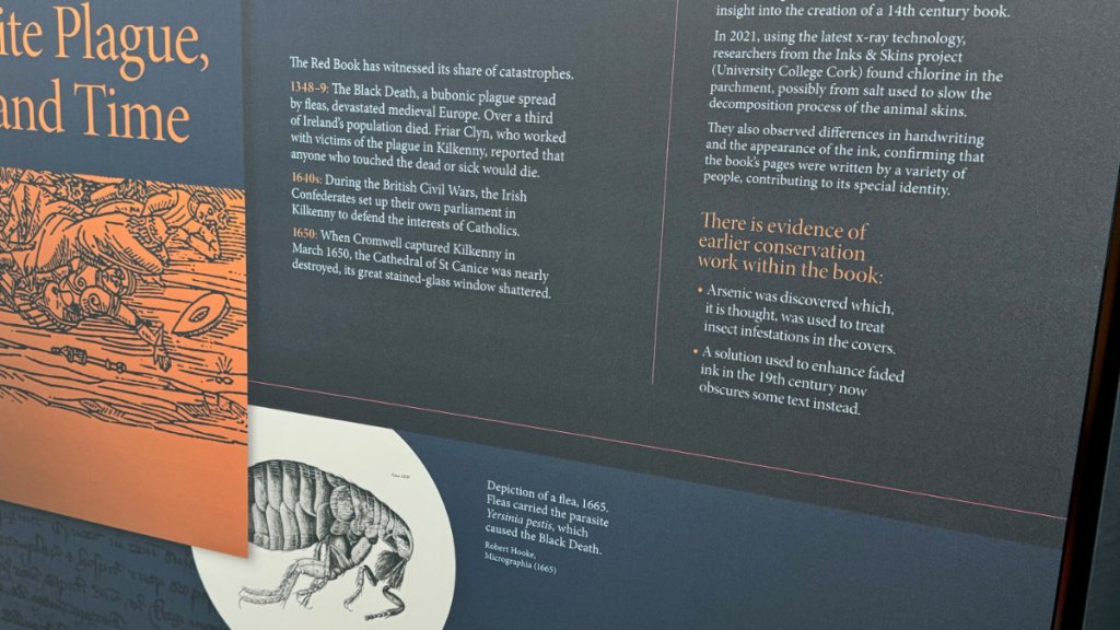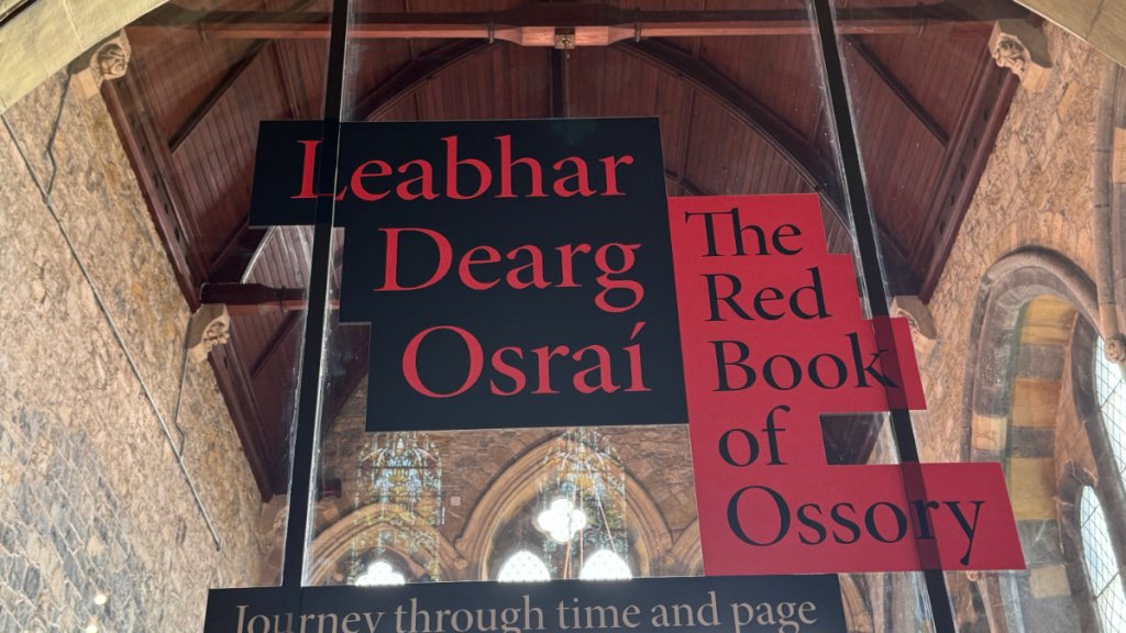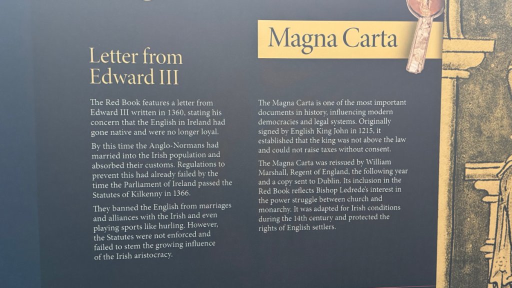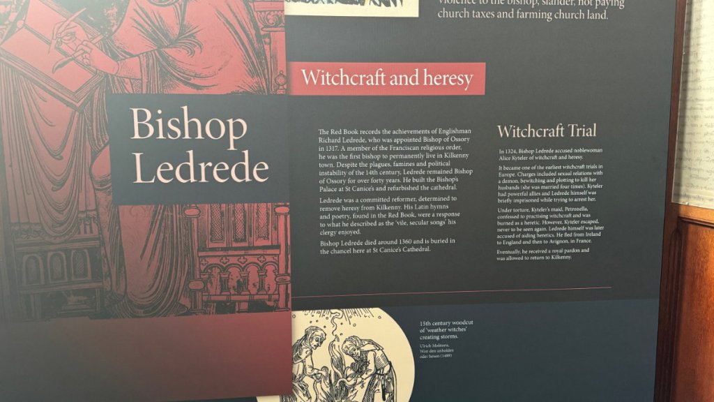 There is a round tower that belongs to the cathedral. I chose not to take the option of climbing up the inside of it. It’s fairly cramped at the bottom and becomes narrow as it rises – not a successful combination for an individual with a fear of heights and claustrophobia. The centre-piece of the tour was the recently returned Red Book of Ossory. It had arrived home in the cathedral the previous Friday having been to Dublin for conservation and study. It’s a Medieval manuscript produced in Kilkenny under the direction of Bishop Ledrede. He accused a local woman, Alice Kyteler and her servant Petronella de Meath of witchcraft. Alice managed to escape leaving Petronella to her fiery fate.