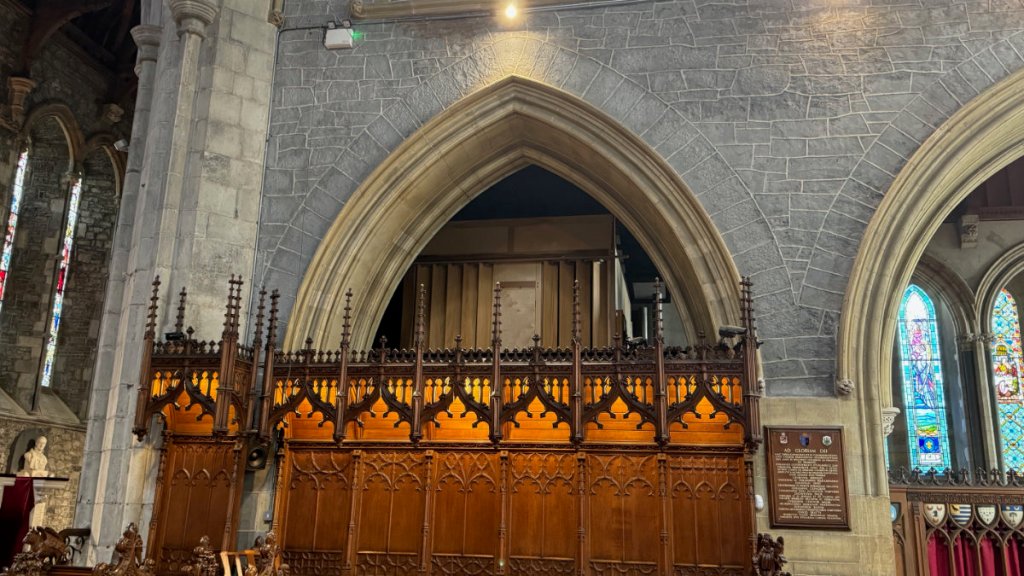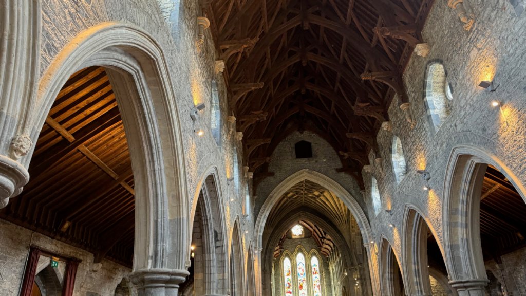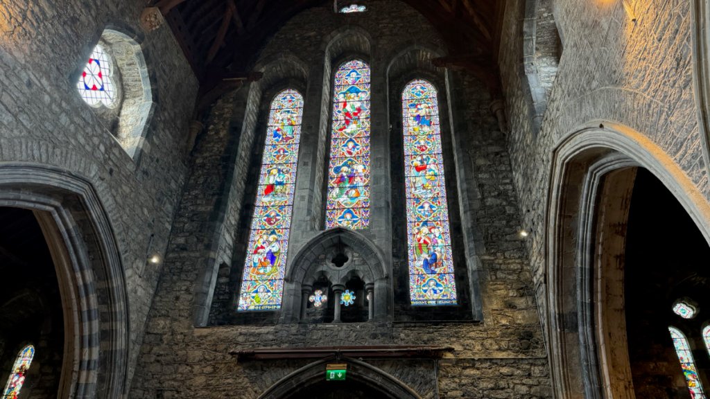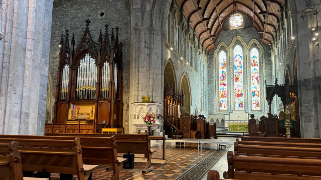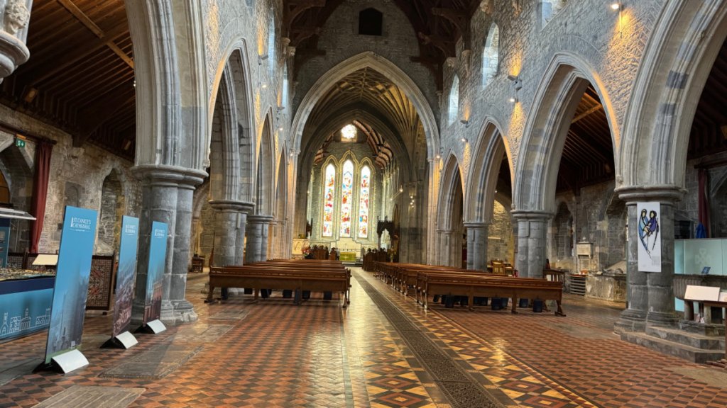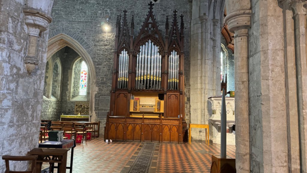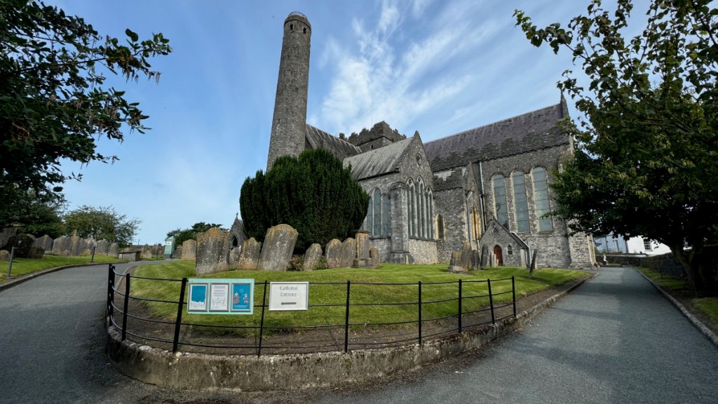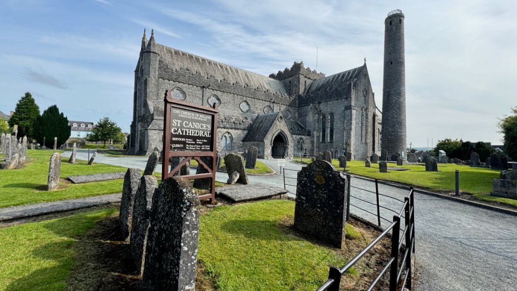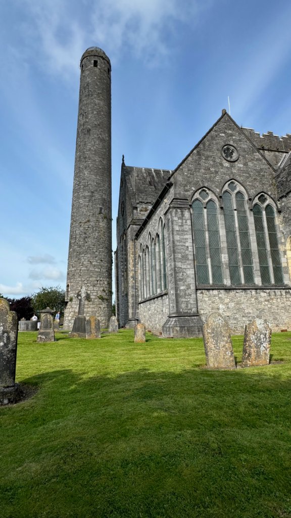 I took a few hours off from harp practice on Tuesday. The weather was brilliant, everything was open and there were some sites that were highly recommended. The first was St. Canice’s Cathedral, Church of Ireland. I should explain that many existing Church of Ireland (Episcopal, Anglican) church buildings were once Roman Catholic properties before the Reformation. Then there was the counter-Reformation when things switched back and that was followed by yet another suppression of Catholicism in Ireland. No further comment, other than to say the effects were far reaching.
