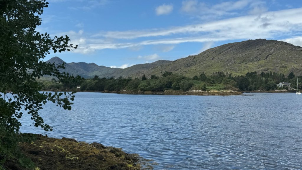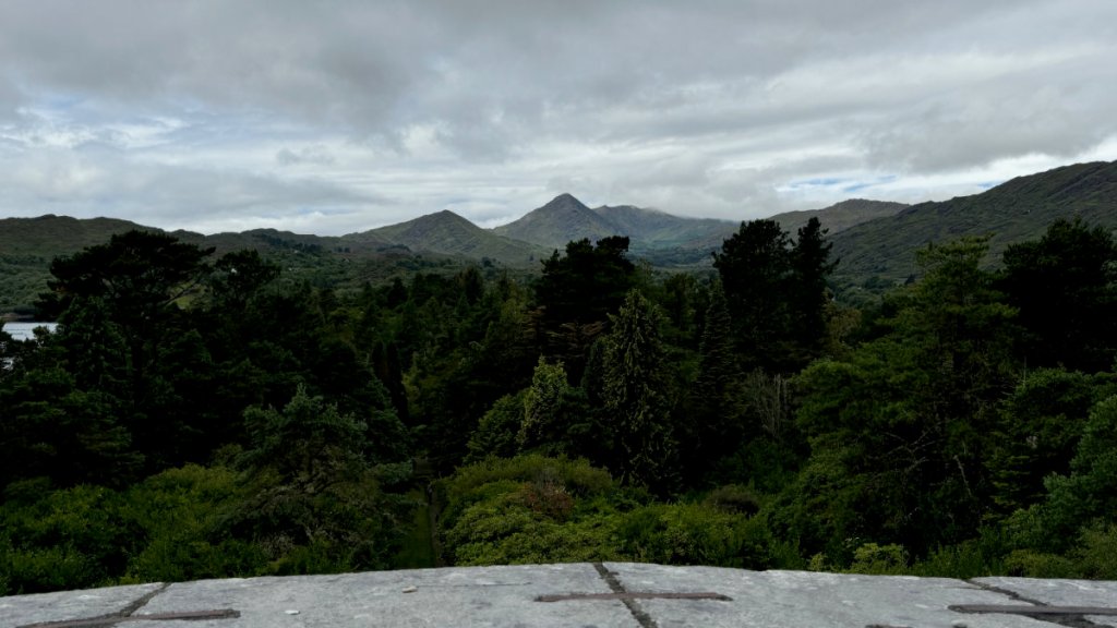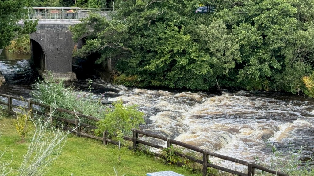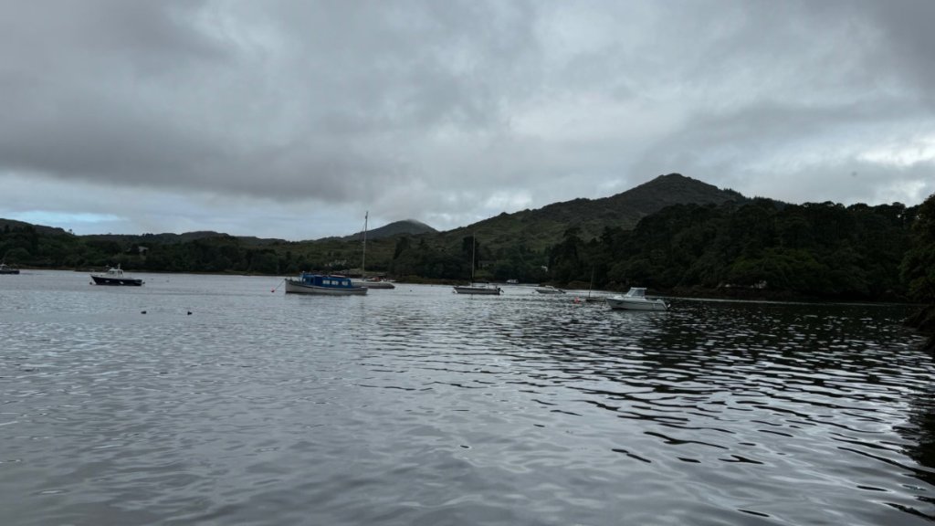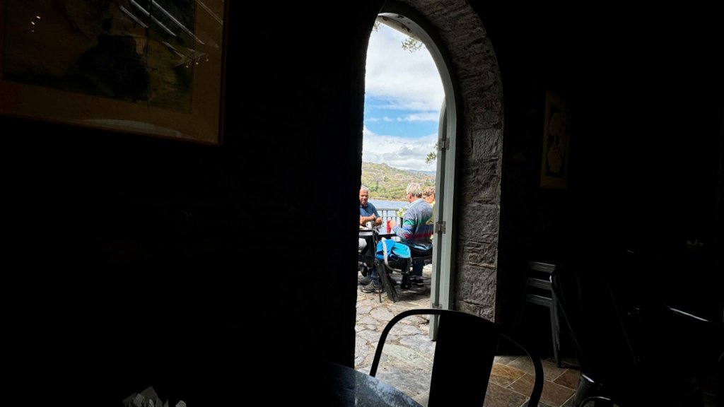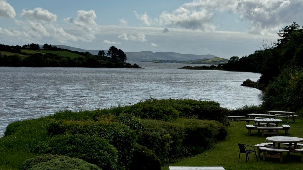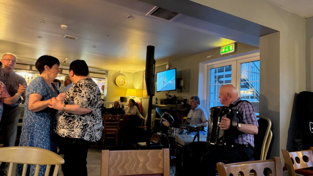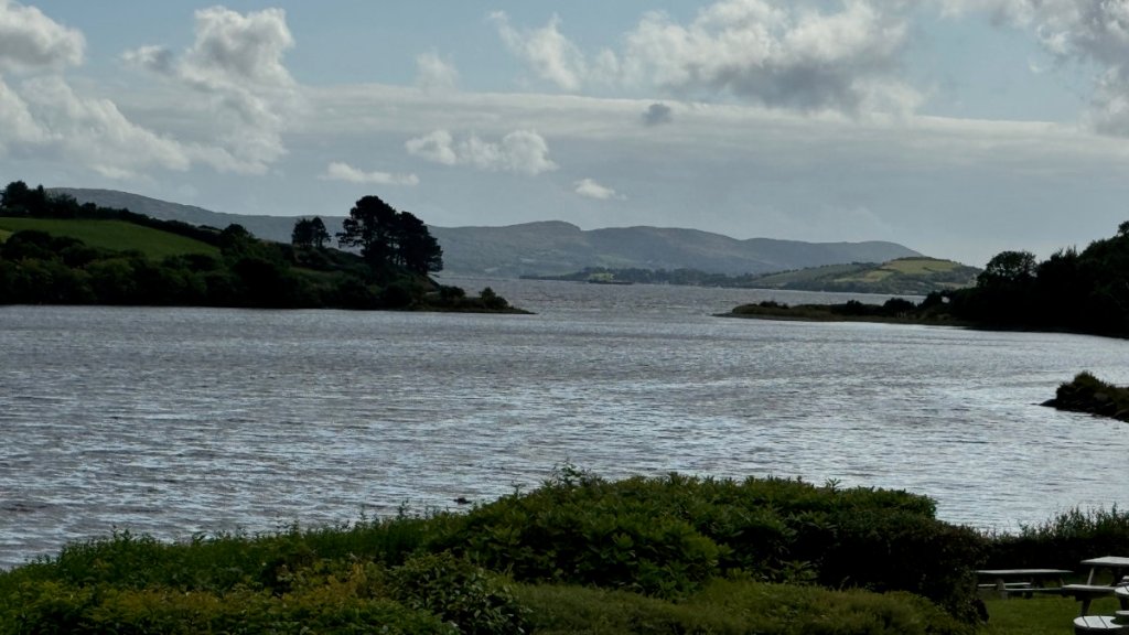 Having followed a somewhat circuitous route after the turn mishap near Cork, I arrived at the Ouvane Falls Hotel not far from Bantry. It was yet daylight and I was hoping the kitchen would still be open. I had phoned to let them know I would be arriving later than anticipated. Dinner was delicious but what followed was so much fun. I was sitting in the mud/dining room enjoying a pint of Beamish and the view of the river when all of a sudden a crowd of men and women began arriving and the waiter began moving tables and chairs. There was going to be a live band with Ceilidh dancing. What a friendly bunch! They get together every Sunday evening with the two or three band members and dance the traditional dances plus foxtrots and waltzes. The Ceilidh dancing reminded me of our square dances; promenades, à la main droit, doh, is, doh, etc. In this case, there wasn’t a caller; the dancers seemed to know when and what to do at the right moment.