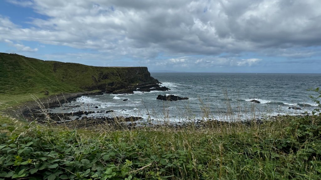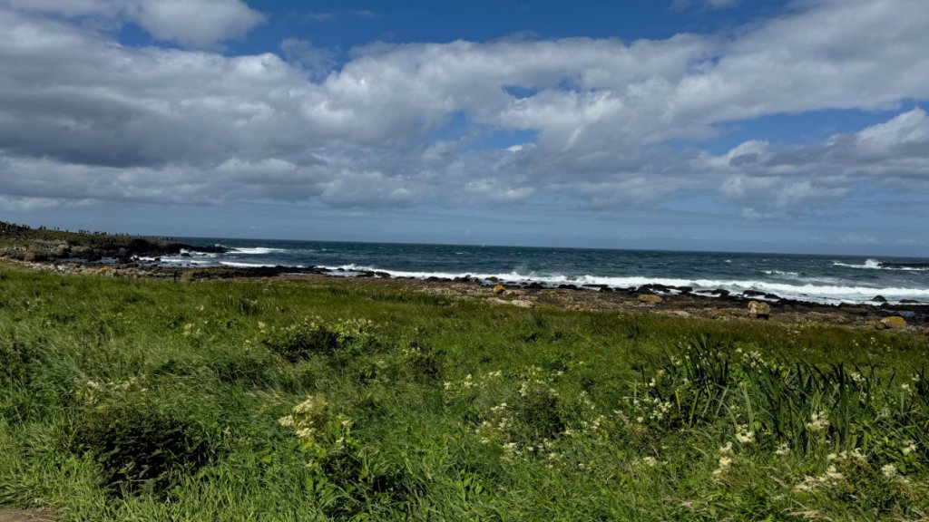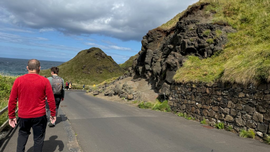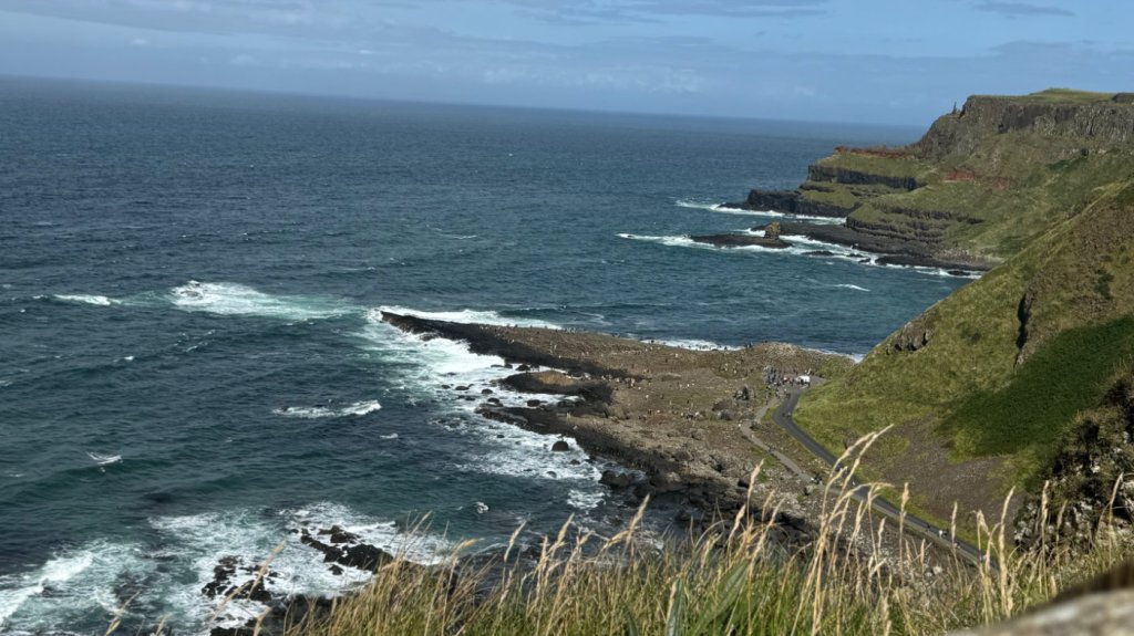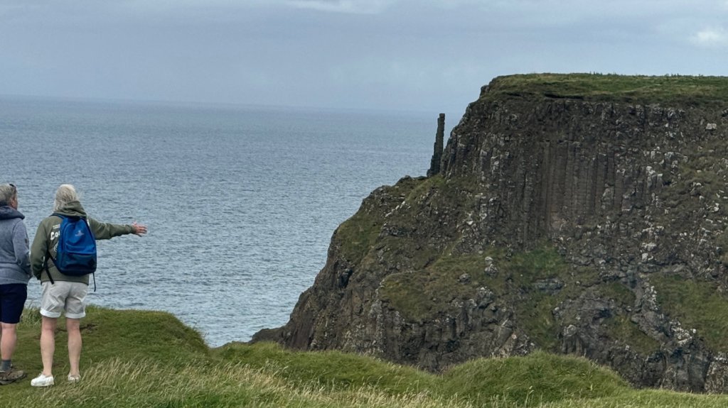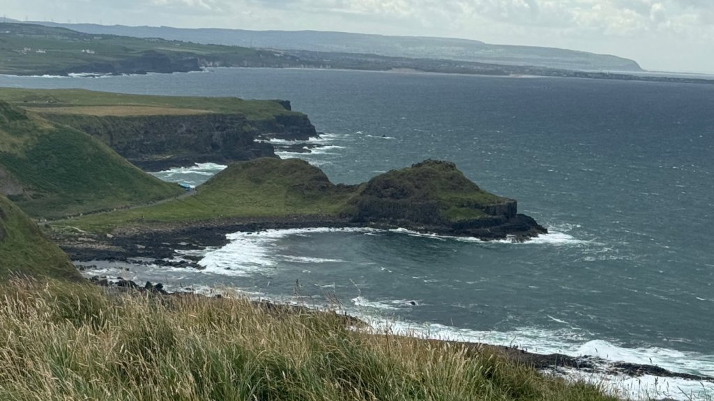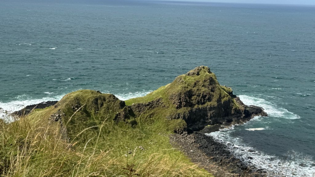 The Giant’s Causeway was the main reason for my trip to Northern Ireland. It’s approximately an hour and a half drive from where I was staying to its location on the northern coastline of the island. I booked my entry ticket online which included an arrival time, parking and a group tour of the site. The countryside was spectacular, lots of very prosperous looking farms with grain crops being harvested and hay being cut and dried. The drying part is not so easy with the amount of rain that has been falling. After a hearty breakfast of hot porridge with fresh fruit and coffee, the trip began.
