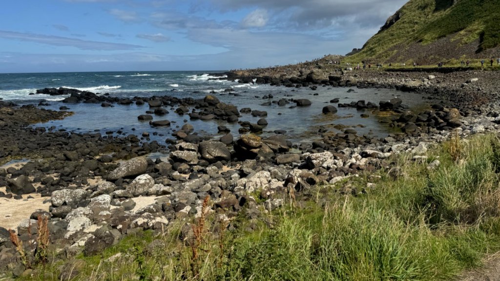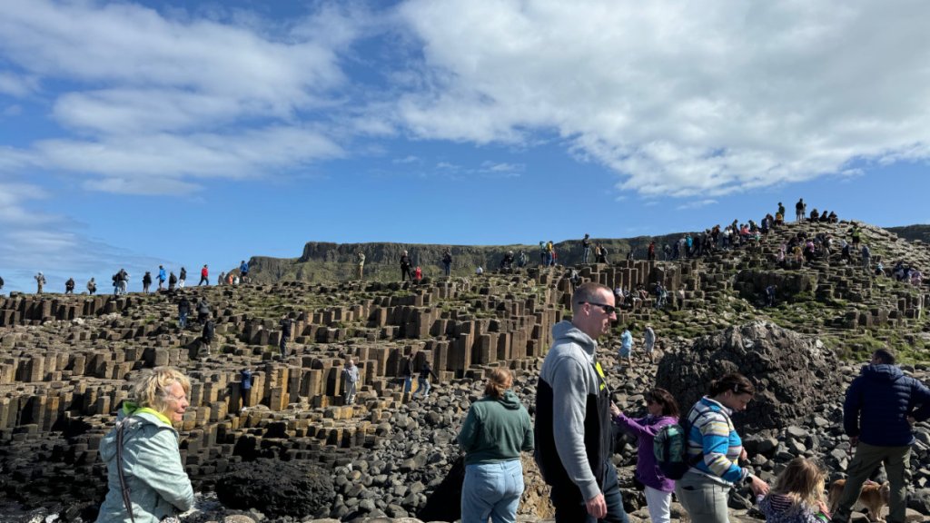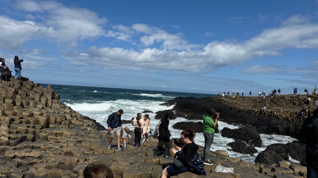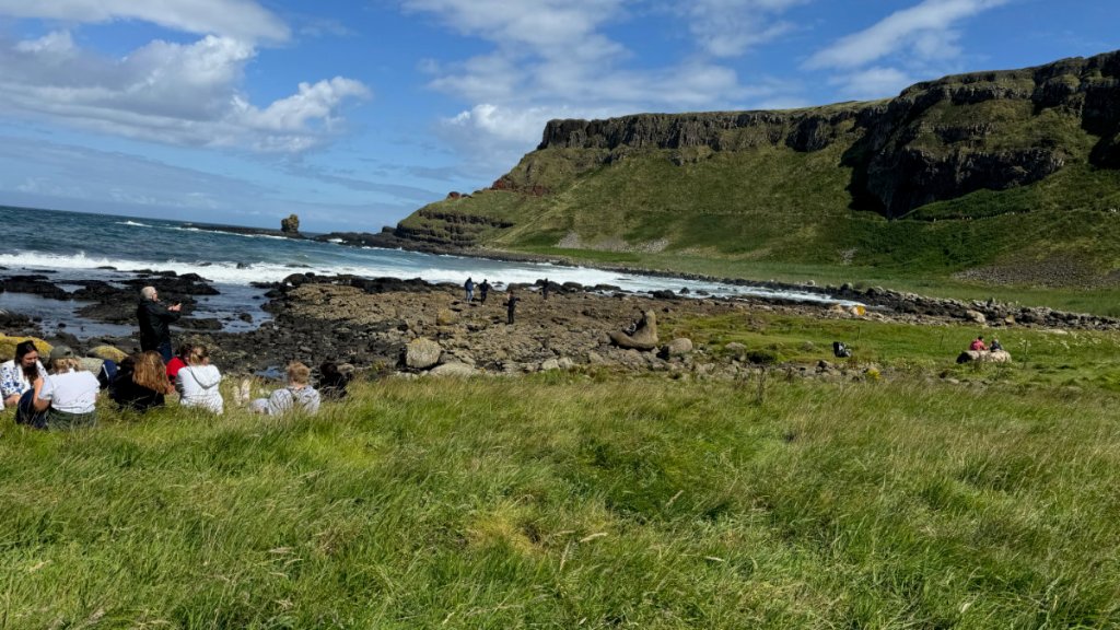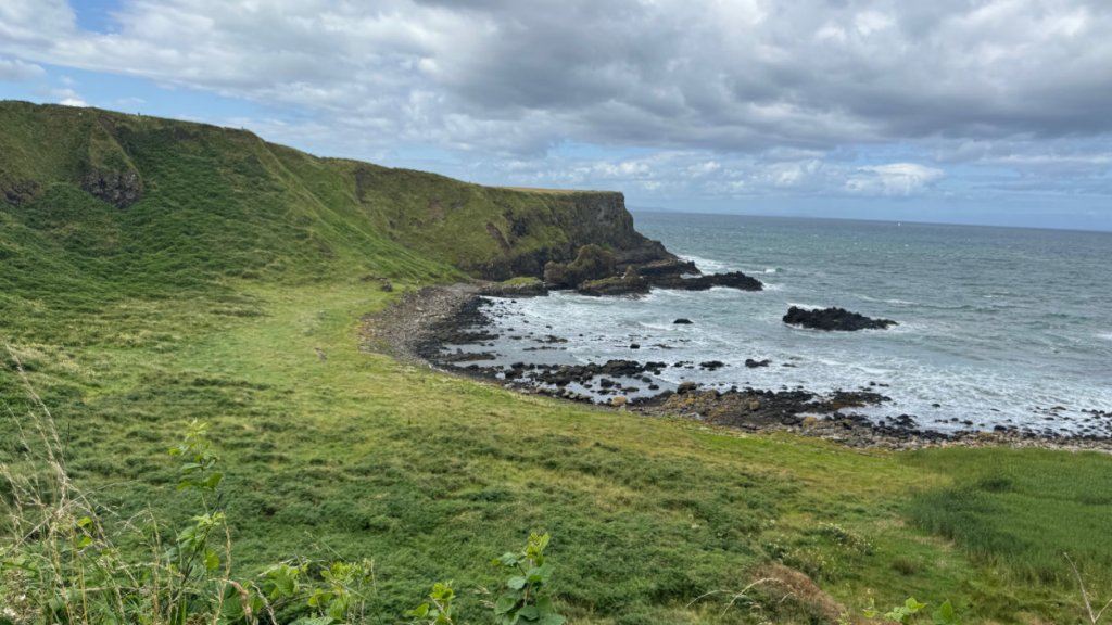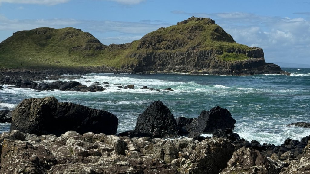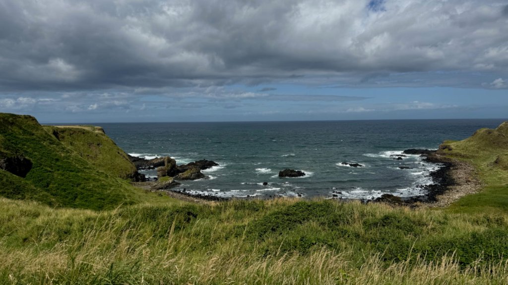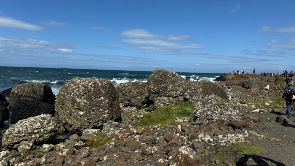 The Giant’s Causeway was the main reason for my trip to Northern Ireland. It’s approximately an hour and a half drive from where I was staying to its location on the northern coastline of the island. I booked my entry ticket online which included an arrival time, parking and a group tour of the site. The countryside was spectacular, lots of very prosperous looking farms with grain crops being harvested and hay being cut and dried. The drying part is not so easy with the amount of rain that has been falling. After a hearty breakfast of hot porridge with fresh fruit and coffee, the trip began.