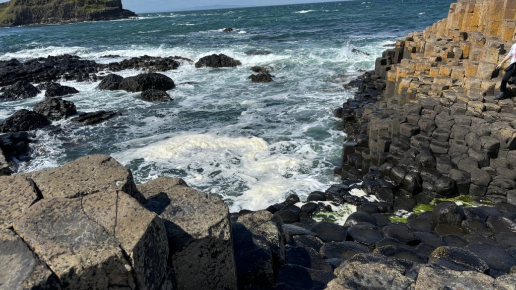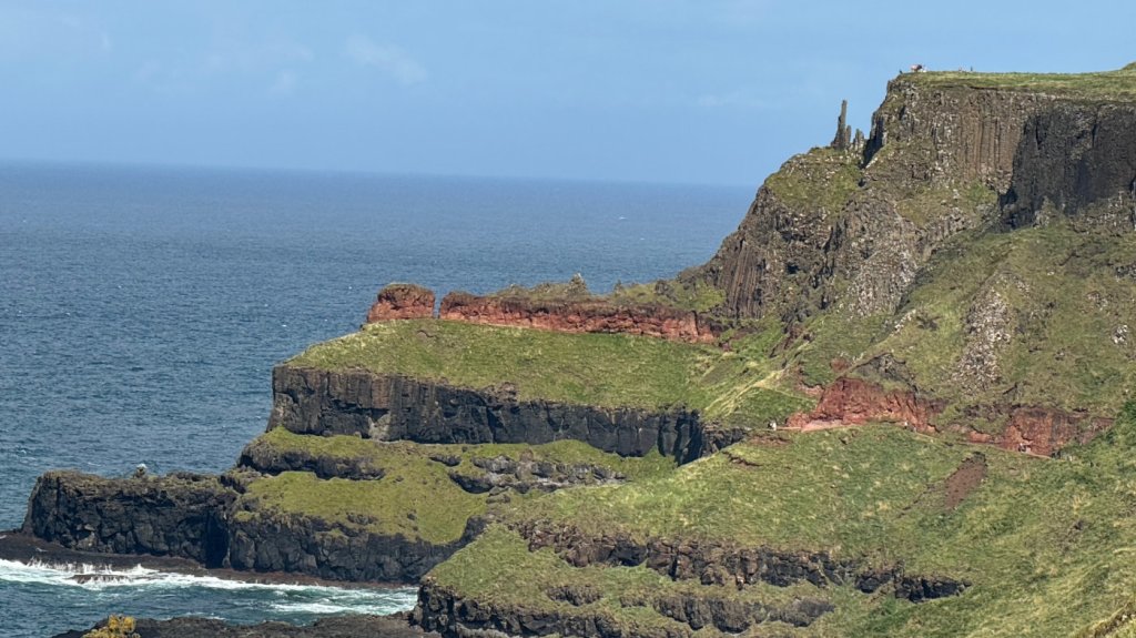 Spoiler alert! There were no giants, not ever! The Causeway was formed by slow moving lava flows, several at the same time and the result was the geologic formations we see today. They are symmetrical in nature and were popularized at the end of the 18th century by a local female artist who published her of the site water colour paintings under a pseudonym. Her real name was Susanna Drury (1739) and her work won a prize awarded by the Royal Dublin Society. They were engraved in 1743 and sold well. Today, over 900,000 people visit the site per year. The National Trust took over responsibility for the site in the 1960s. To my mind, it is well organized and there is concerted effort to return the area to its natural state and maintain it as such. Our guide left us to our own devices once we reached the Causeway. I explore the possibility of walking up the trail/stairs to the top of the cliff but decided against it. Instead, I retraced my steps to the starting point, had lunch and then followed the trail along the top of the cliff overlooking the bay. The view was spectacular in all directions and the wind was blowing like crazy.