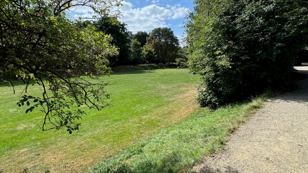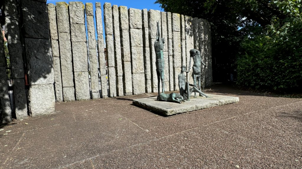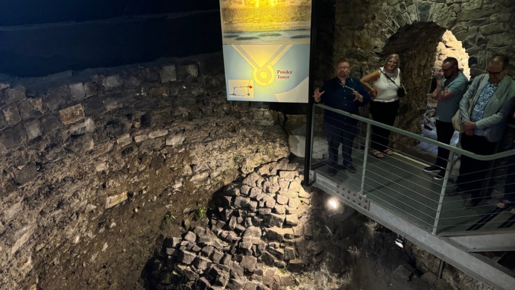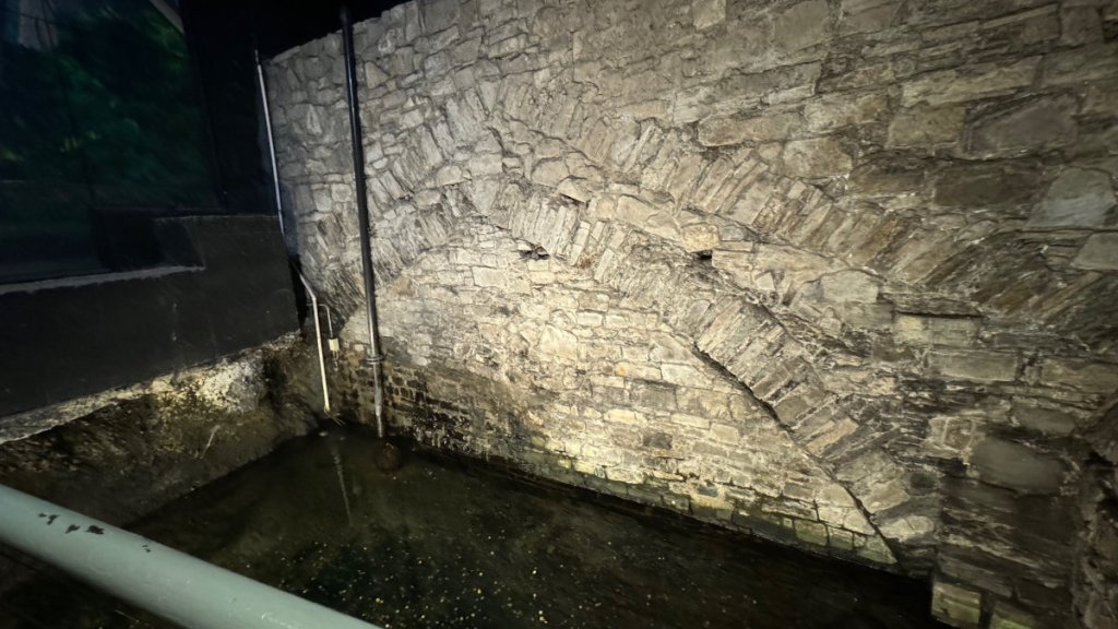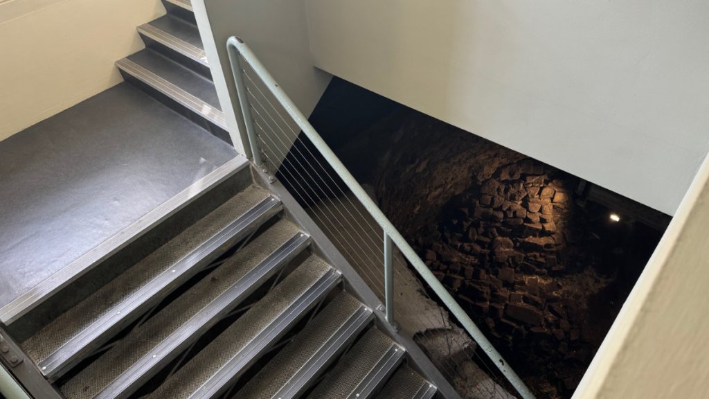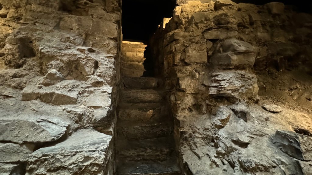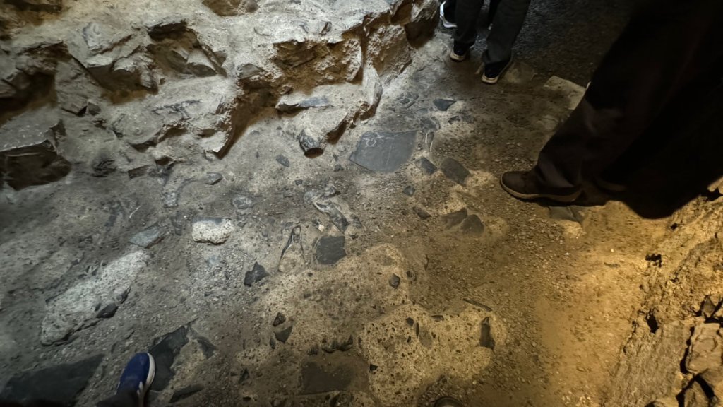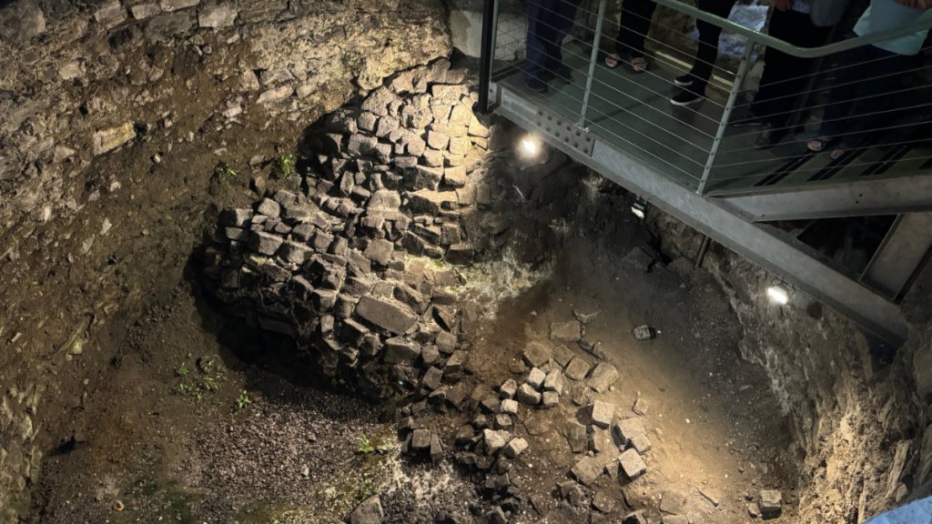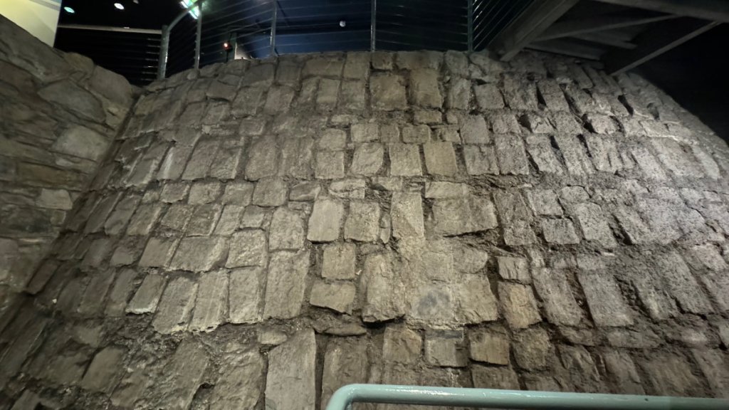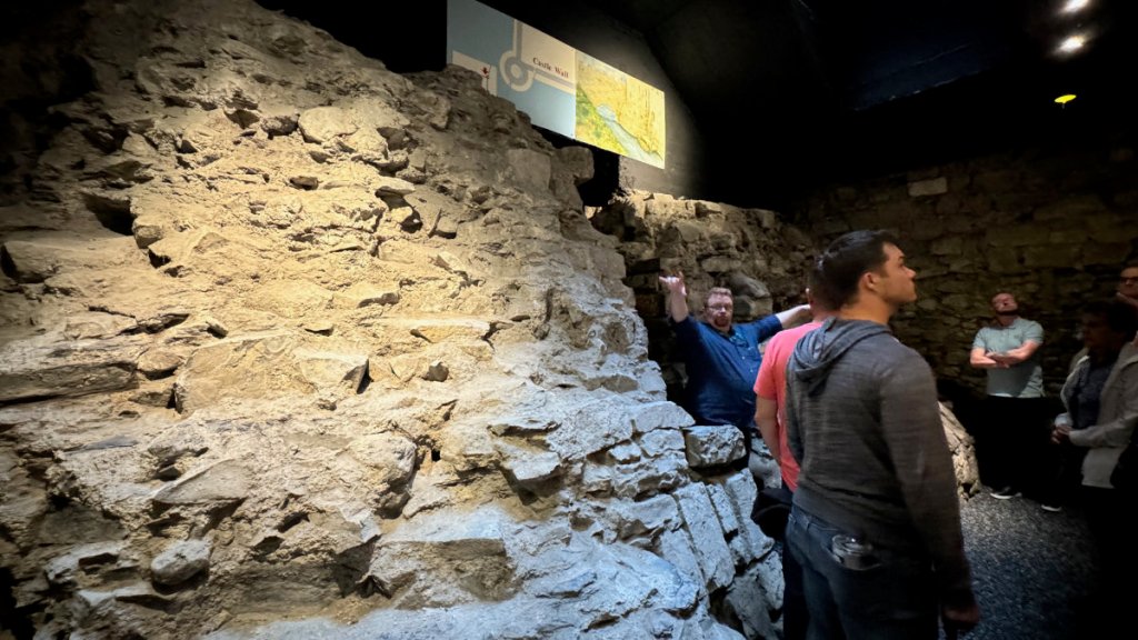 Our tour began with a brief introduction in the courtyard and then we headed underground. Remember my comment about underground rivers and subsidence? We were headed into an underground chamber that came about after a section of the building subsided in the early 1980s. The solution was to remove the section and dig down to remove the crumbling foundation. In the process, a viking wall and foundation of the original town were found and, of course, the archeologists took over. Eventually, everything was reconstructed over and around the Viking find and we were on our way to see it. By the way, it wasn’t the section of building where the tax department lives that subsided.