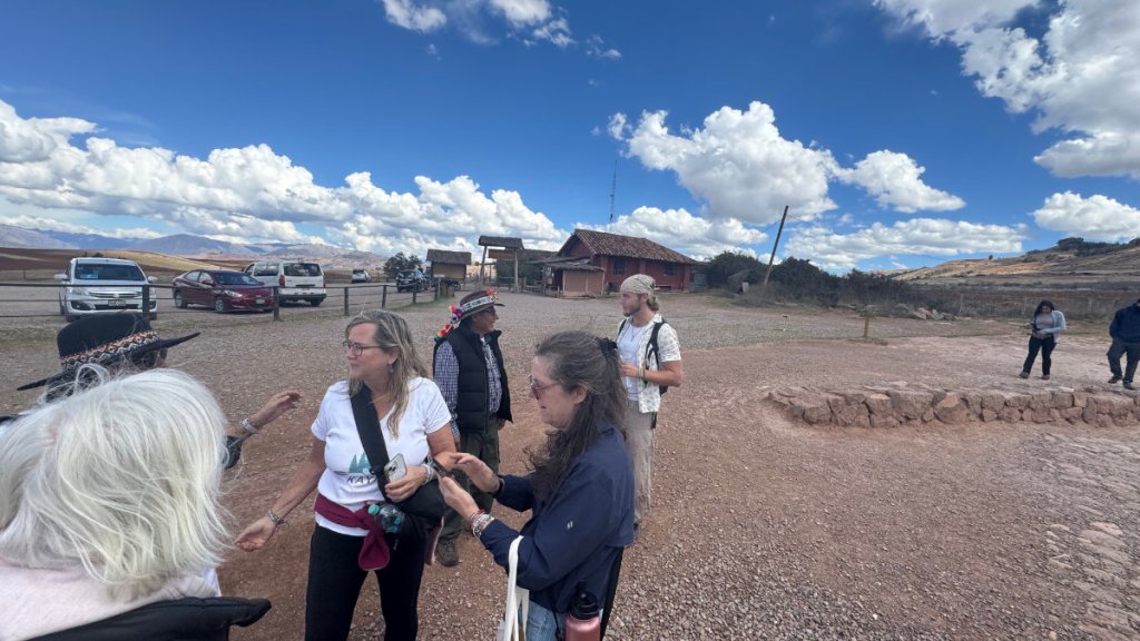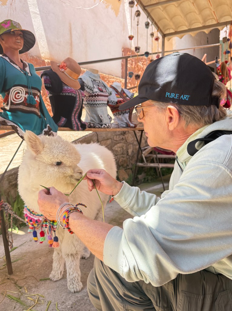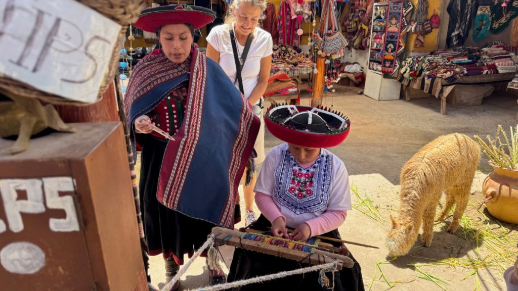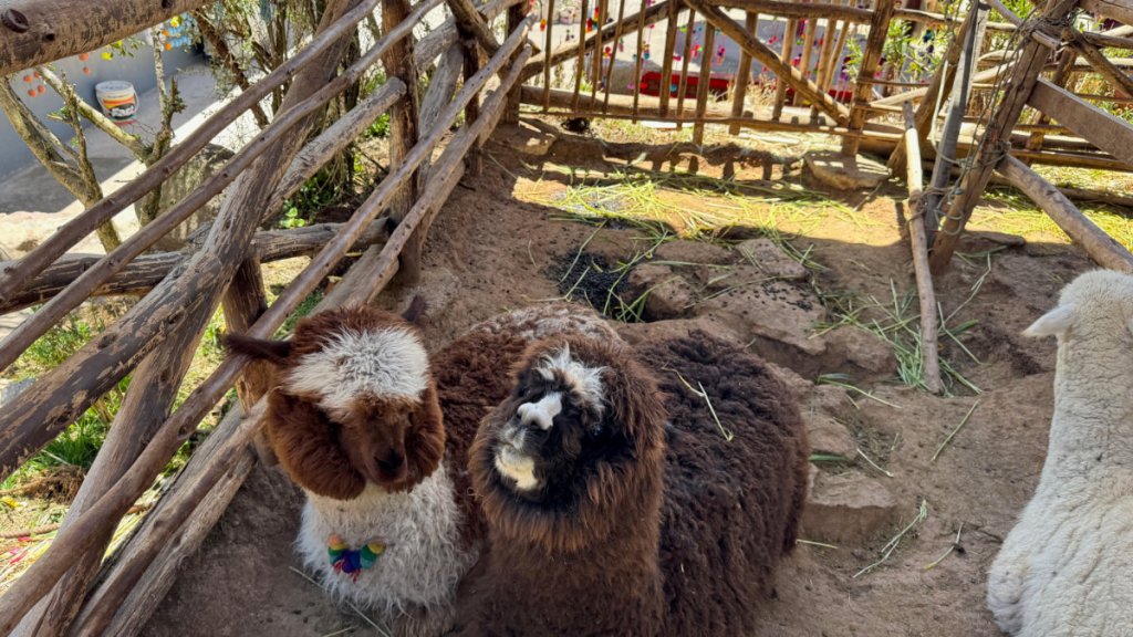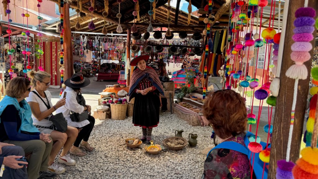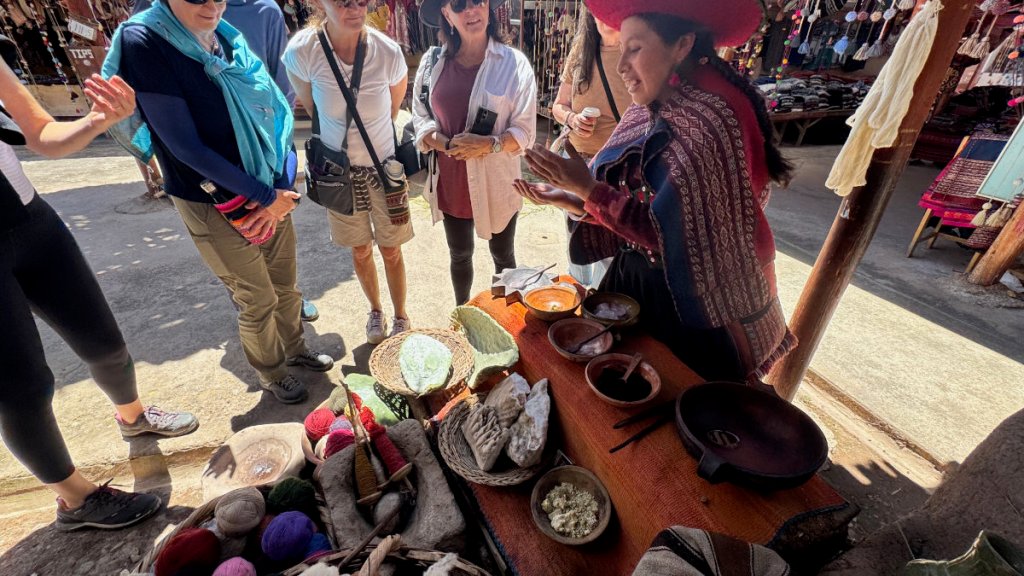 Chinchero is situated 3,760 metres above sea level and is also a market town with merchants targeting tourists with a wide variety of merchandise from jewelry to textiles. I resisted the temptations although it was quite difficult! I knew I would have a better opportunity for shopping in Pisac the next day. After a light snack and a bathroom break, we headed off to visit a women’s collective llama farm where we were treated to a wool dying and weaving demonstration. I supported the collective by shopping!