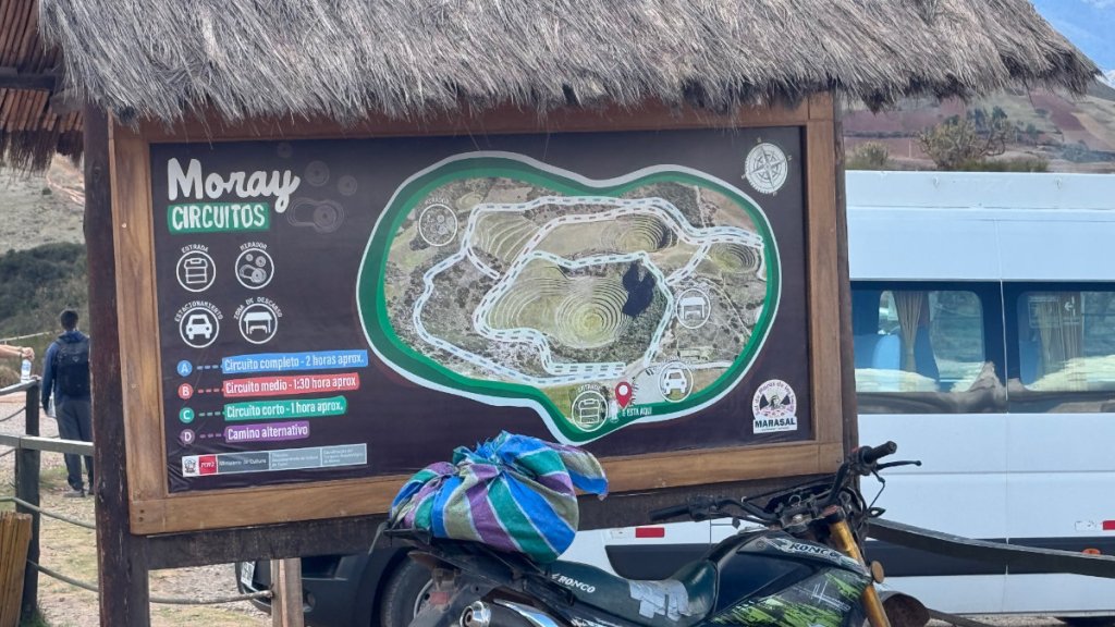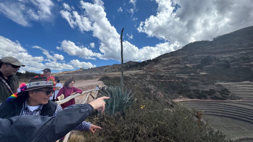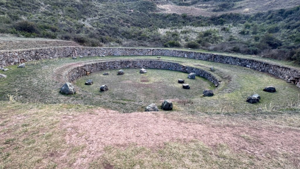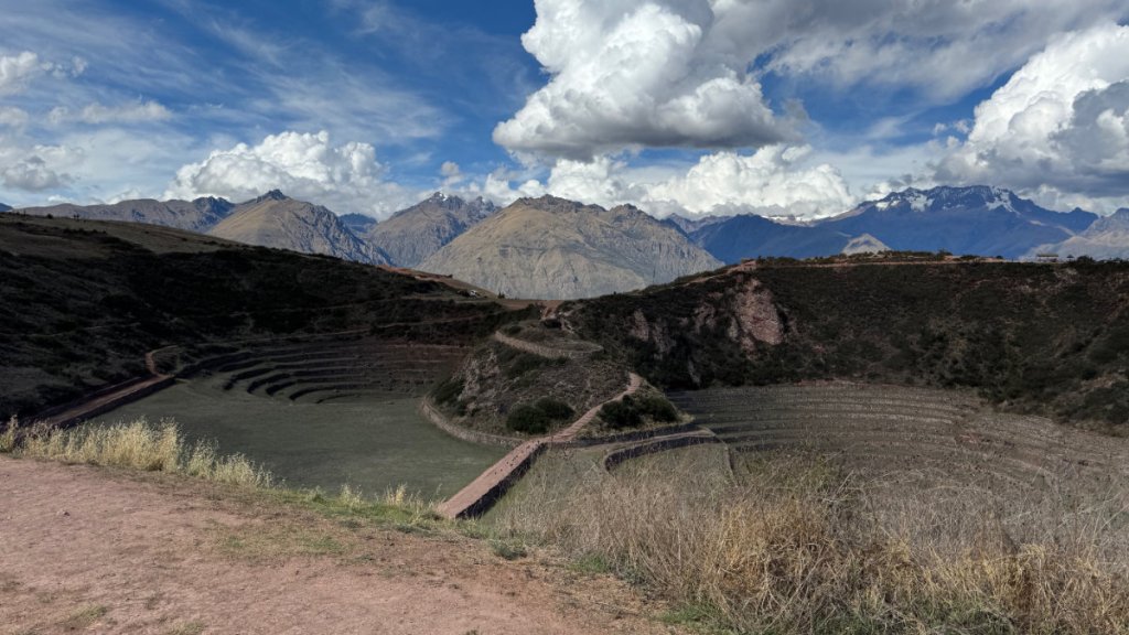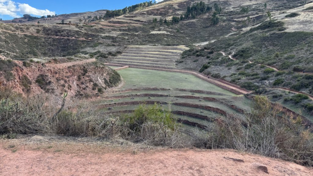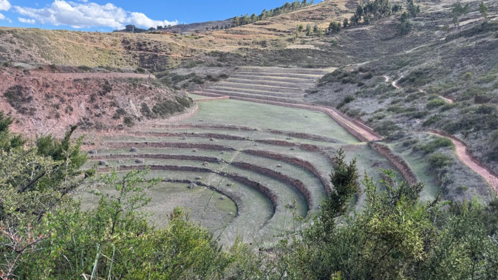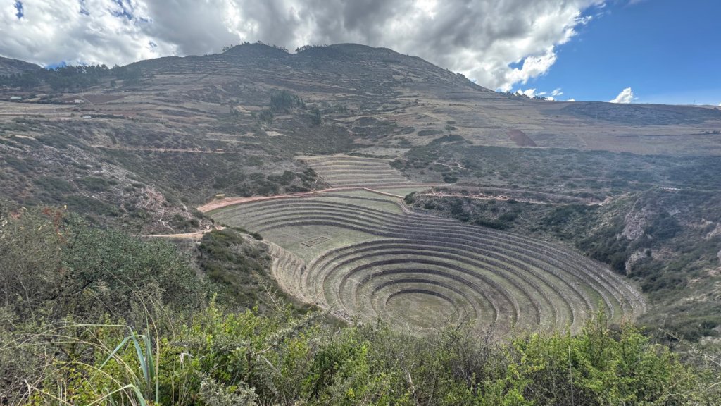 The Inca ruins of Moray or Muray have always been a bit of mystery. Originally, it may have been an open pit mine but was transformed into an immense experimental farm. There is a variation of 30 degrees Celsius from the bottom of the pit to the top creating a variety of microclimates similar to those found throughout the Inca empire. Soil samples indicate that earth was brought in from various parts of the empire and used at specific levels to create the terraces.