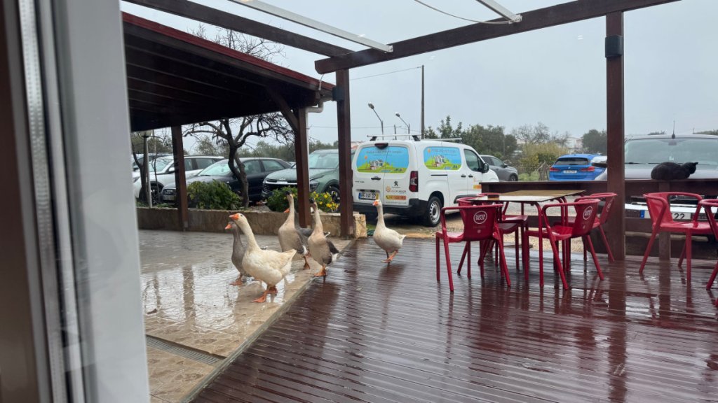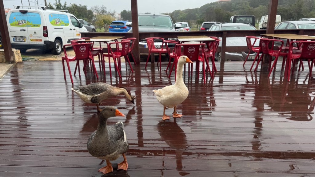 Now here’s a squawk from yesterday’s news and views. I went out for lunch with Randy and Marc to Restaurant Horta. It’s but a hop and a skip, no jump, from their new digs. On deck, there was an absolutely grand entertainment provided by a local gaggle of geese in the softly falling rain.