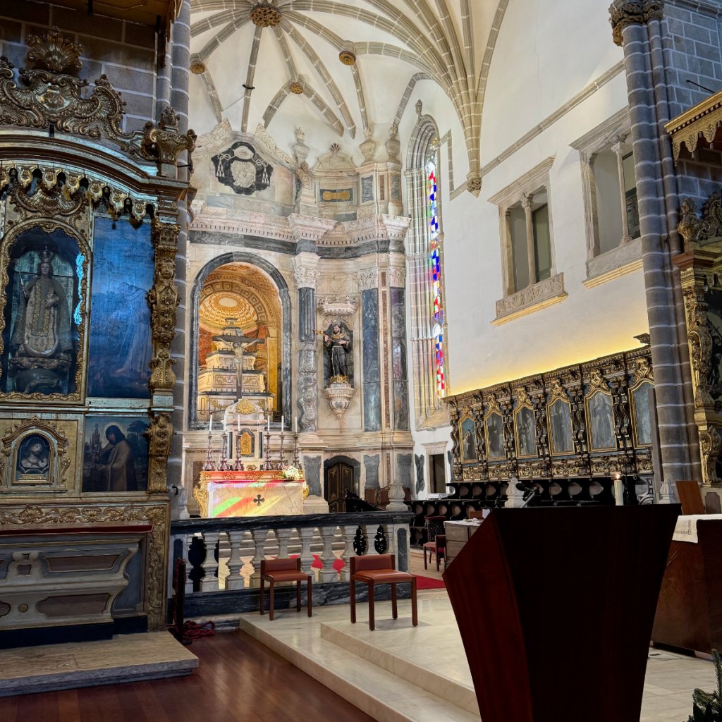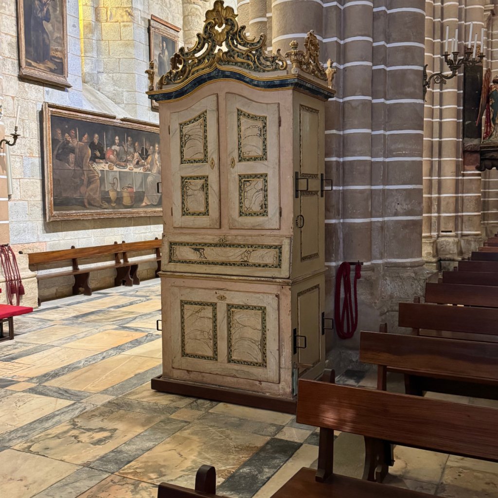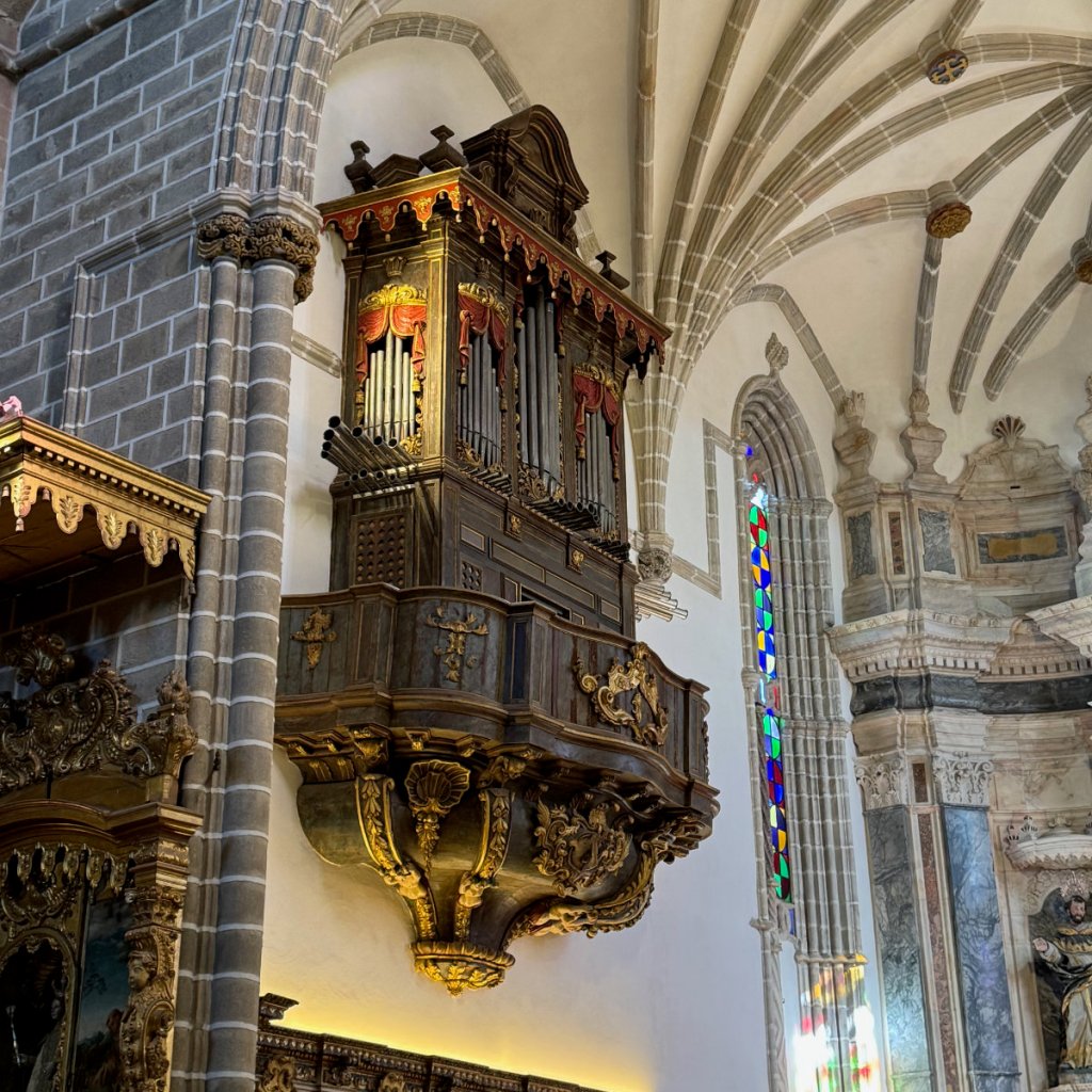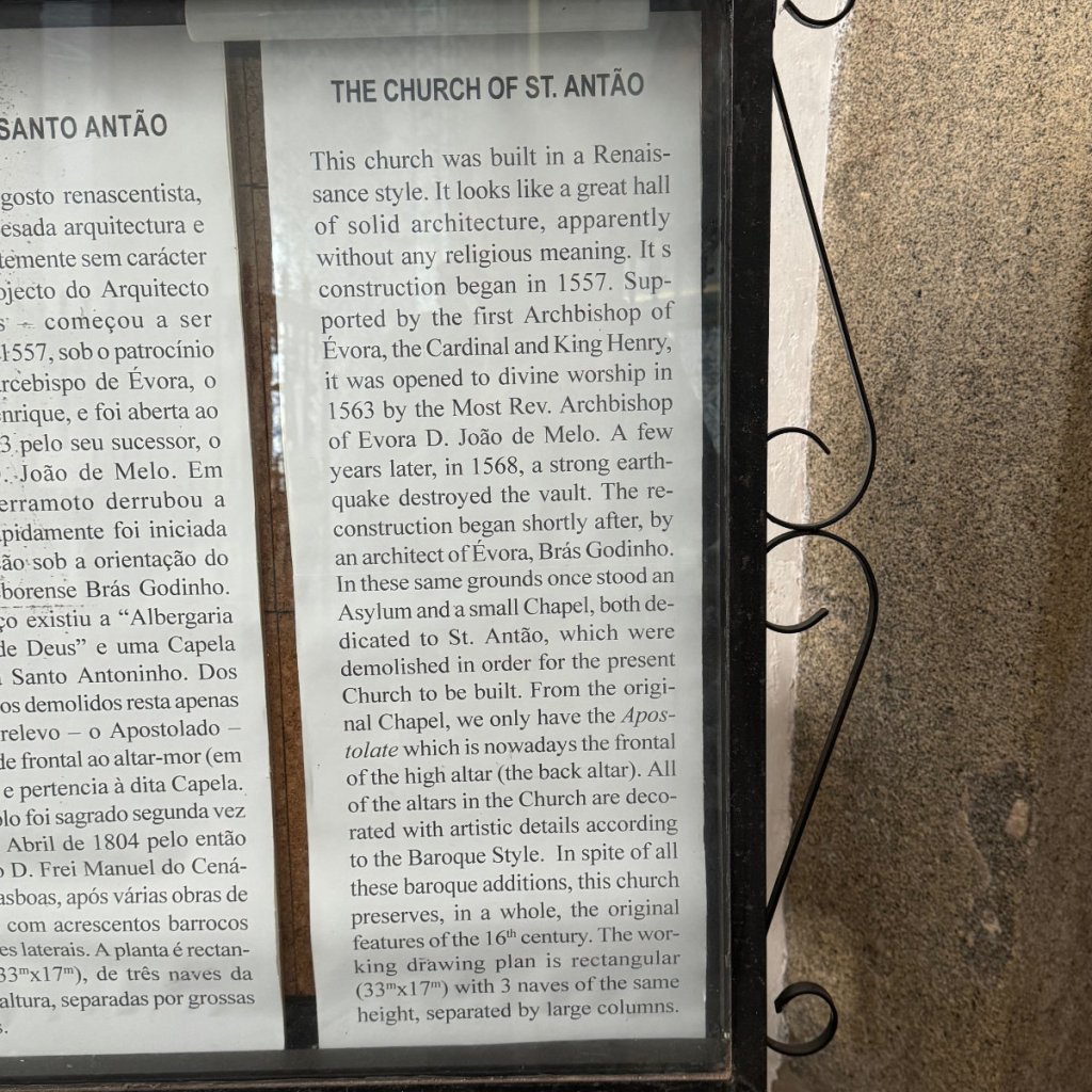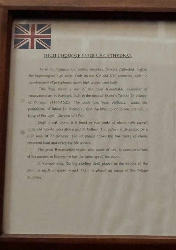 There are currently four pipe organs in the cathedral. The two largest are permanently in place: number one over the main door next to the High Choir and number four in the chancel. The High Choir Organ is also known as the Japanese organ. The designation comes from 1584 when four Japanese men visited the city as part of a cultural exchange mission. During the visit, they heard an organ performance at the cathedral, possibly the chancel organ (my guess). The result was the construction of a beautiful instrument combining the skills of Portuguese and Japanese craftsmen. The work was overseen by an Italian organ builder Francesco Cortez and Sukematsu Ito and other Japanese craftsmen. All of these instruments can be heard during an annual organ festival held in Évora. The final recitals of the recent season were in December 2025. I’m going to have to be there one of these years! Next stop Igreja de Santo Antão.
