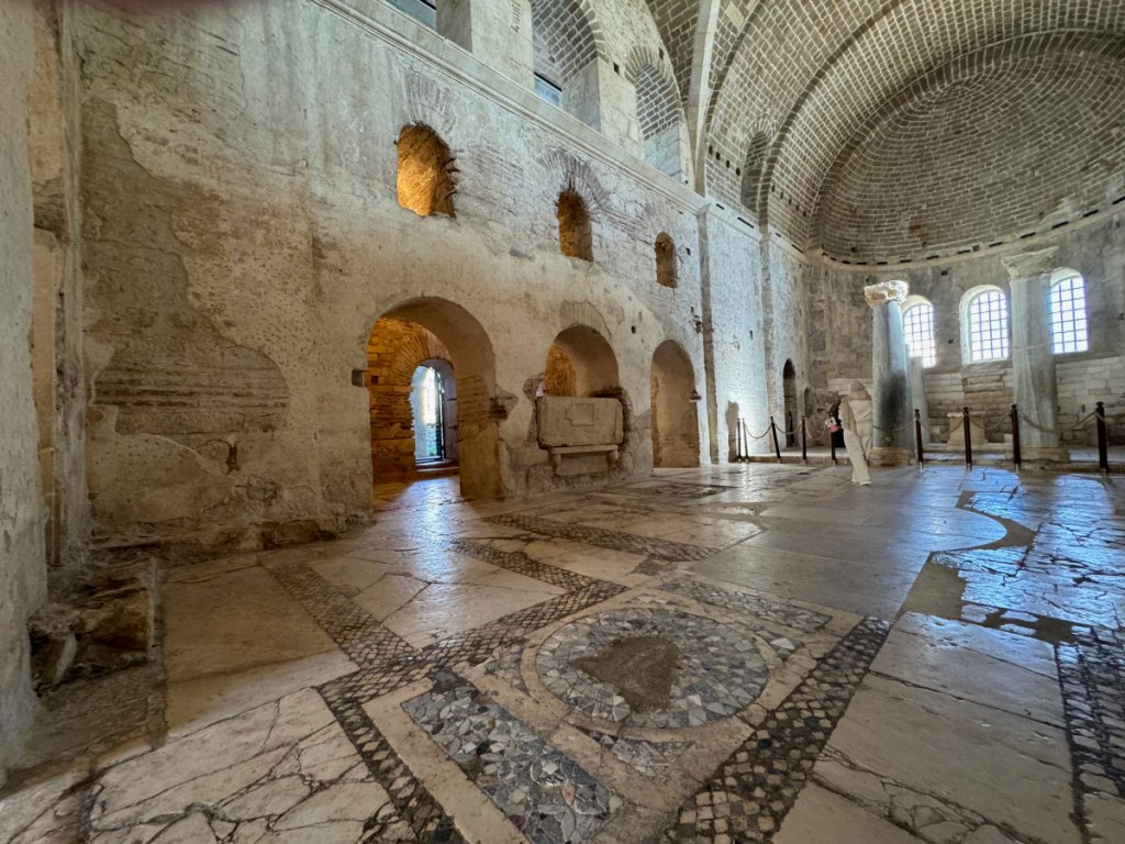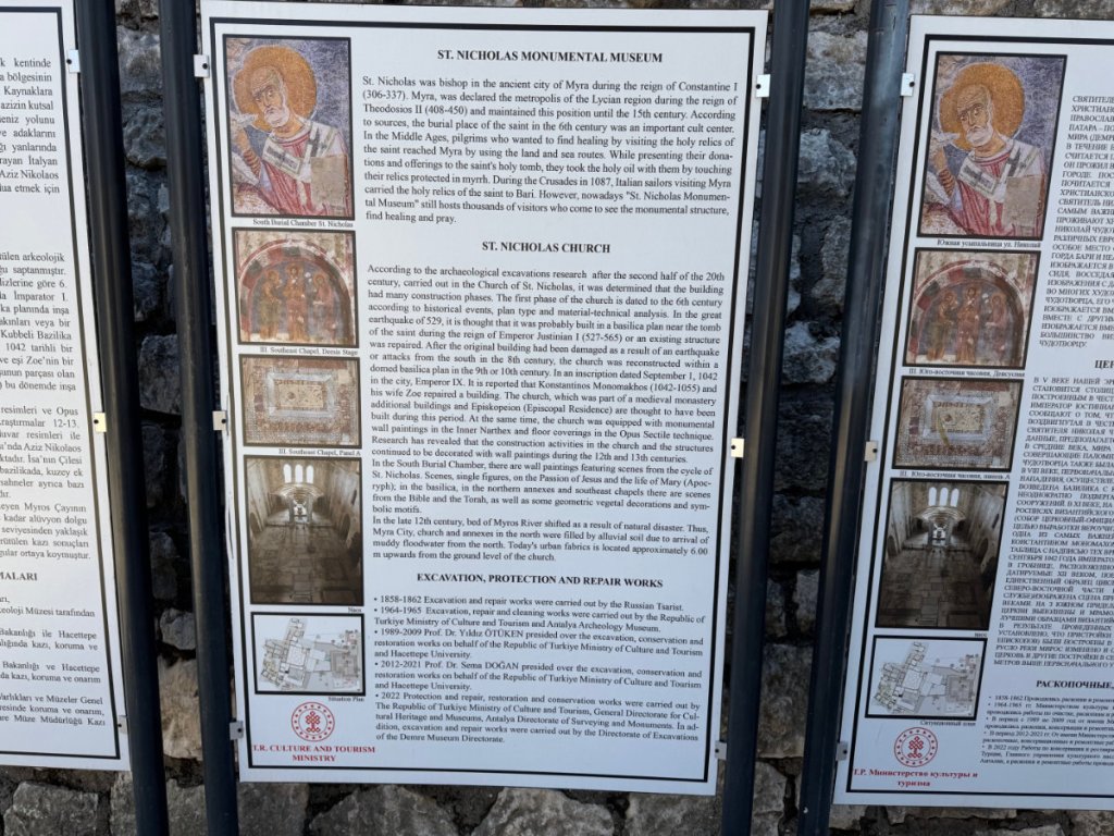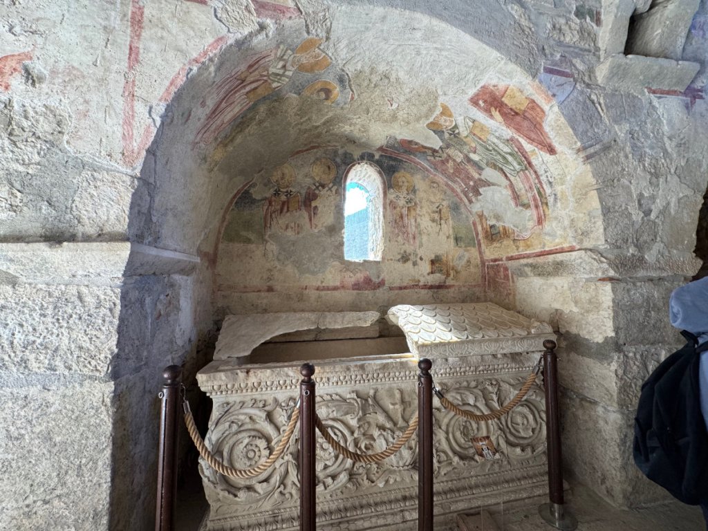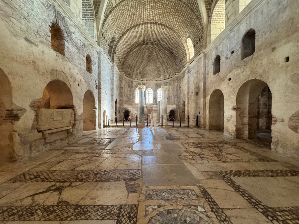 Yes, the commercialized secular Santa Claus originated in the ancient city of Myra, Türkiye in the person of St. Nicholas, Bishop of Myra. Today, the original church of St.Nicholas is a well preserved museum/ruin. It dates from the 8th century CE onward although there has been a church on the site since the Eastern Roman (Byzantine) era in the 6th century. Traditionally, St. Nicholas is thought to have been born in Patara on the 15th of March 270 and died here on 6th December 343. His remains were entombed in the church. In 1087, a group of Italian merchants from Bari, Italy, without permission from anyone, moved most of his skeleton to Bari where they are now enshrined in the Basilica di San Nicola. There was also a monastery attached to this church. In 1863, Emperor Alexander II of Russia purchased the site and began restoration but it was never completed. The building was left to deteriorate in 1923 when the Greek population was forced to leave during the population exchange between Greece and Turkey. Finally, in 1963, excavations began on parts of the site and an area was roofed over in 1968. Further work has been done since 2007. It was a fascinating experience to walk on the floors where centuries ago, Bishop Nicholas and his brothers went about their daily lives. I sat for awhile in a quiet corner and listened for the tread of their footsteps on the stone and mosaic floor, gazed at the remains of faded frescoes that must have blazed with colour in the candlelight. And then, the Muslim call to prayer rang out across the town and I was caught at the juxtaposition of two faiths, many cultures and modern Türkiye. Sublime.