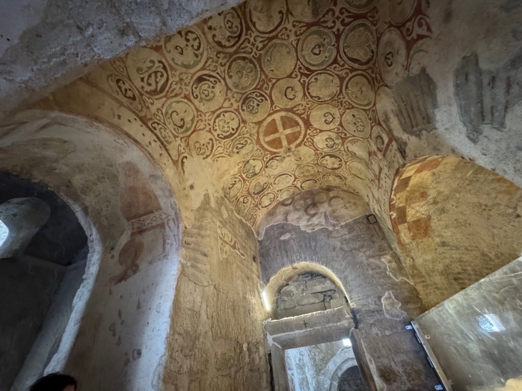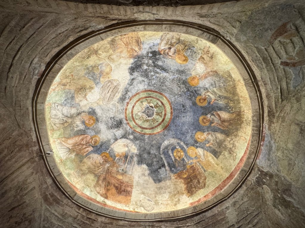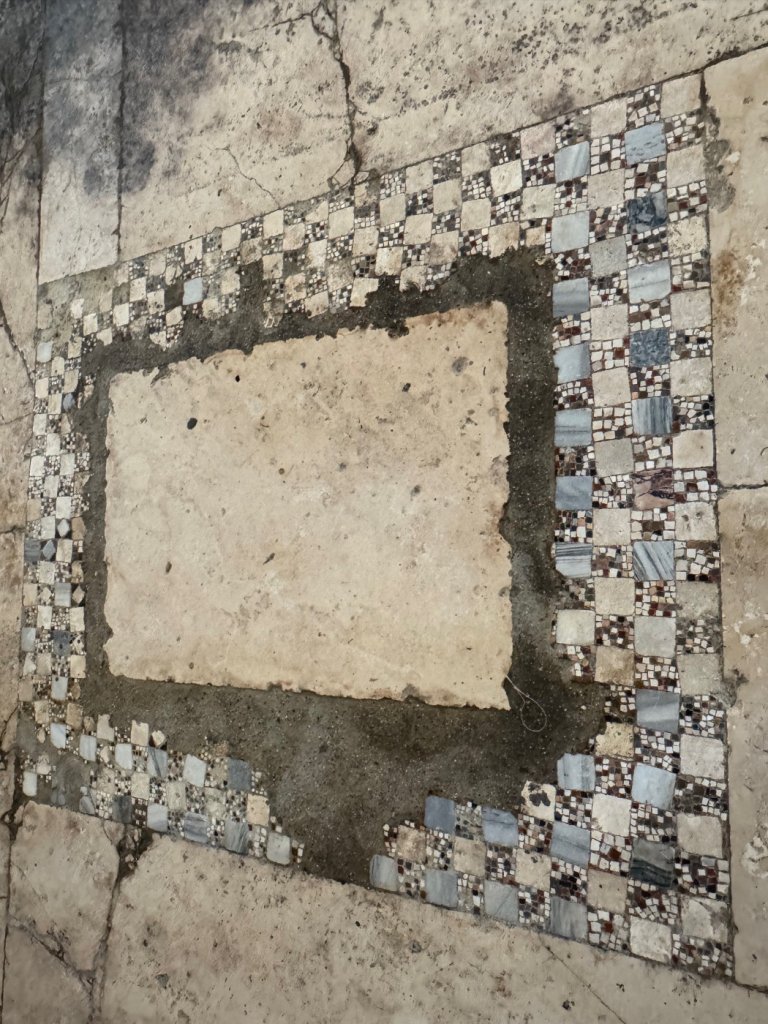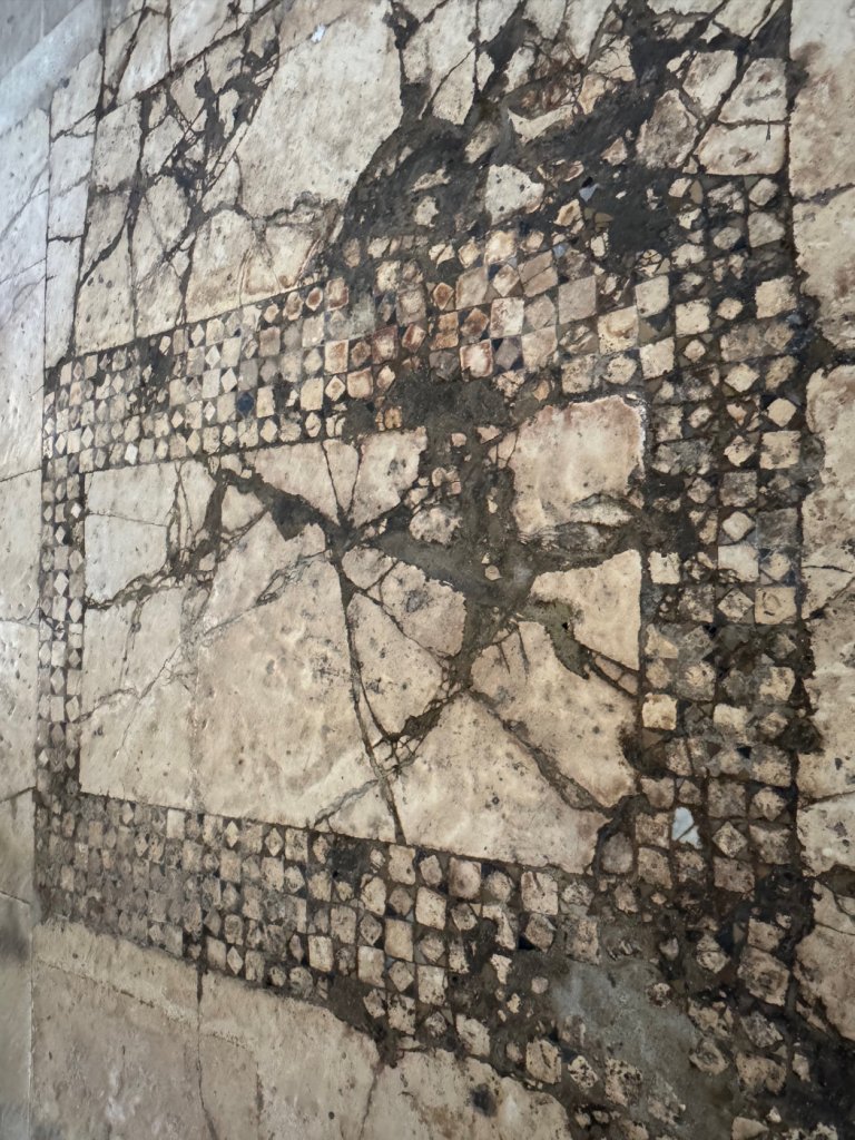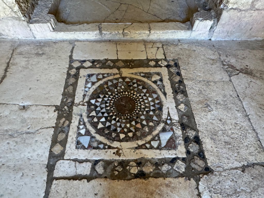 The building is intimate and solidly constructed. The remains of the mosaics on the floor of nave and chancel give a taste of what they must have been like when they were younger. Age hasn’t destroyed their beauty. To give a sense of the size of the building, here is an exterior shot.